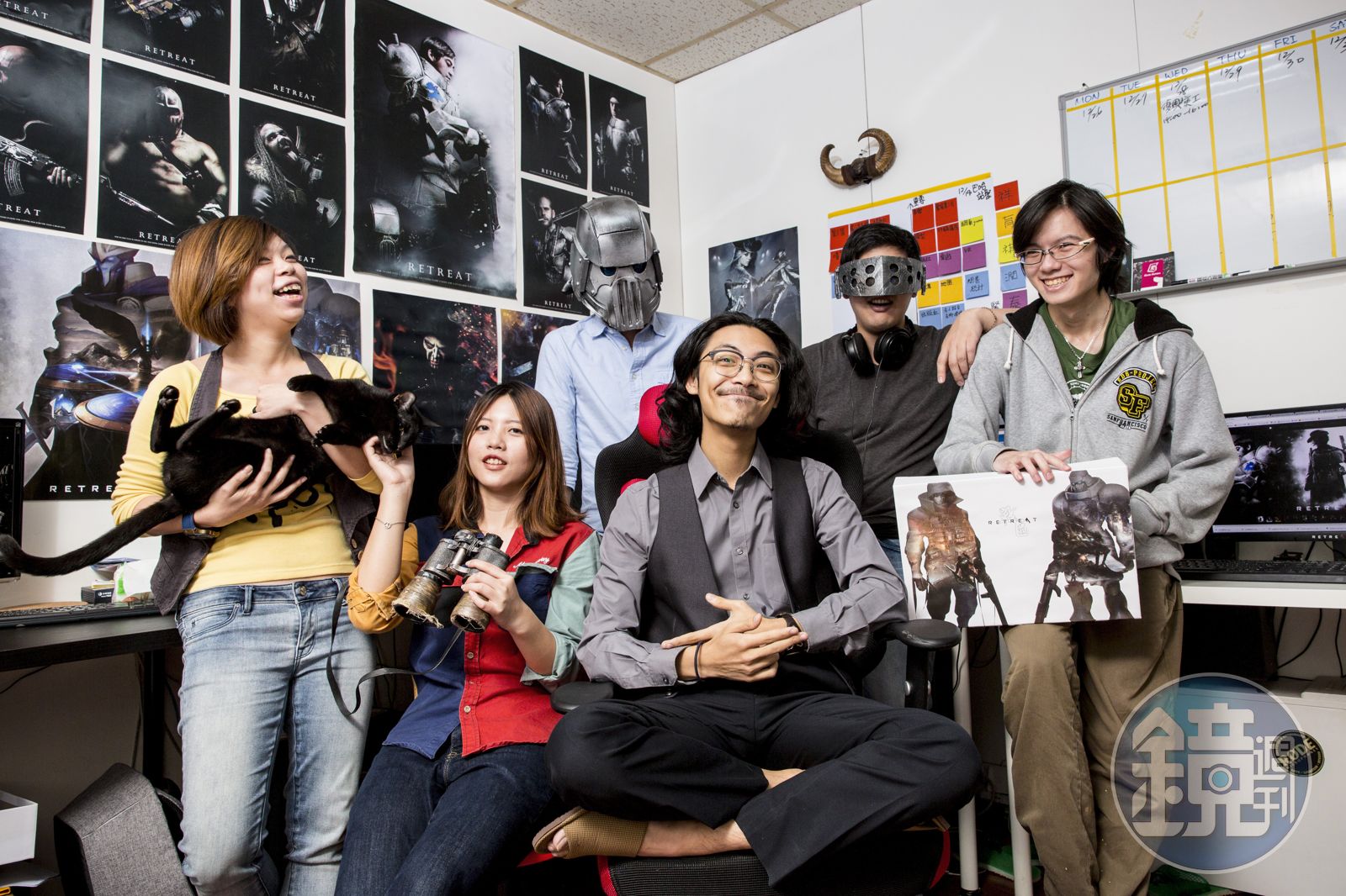 走進《RETREAT》團隊位於台北市大同區一處不到15坪的小工作室,六位成員正埋首創作。留著長髮的團隊負責人,也是身兼編導、美術,年僅27歲的周百祥看到我們到訪,緩緩地說:「等一下喔,我再畫一下。」工作室牆上貼滿了由真人扮演的角色海報、四周散布著《RETREAT》相關產品,包括模型、小說、桌遊,加上在網路曝光的動畫電影片段及研發中的VR遊戲,產品形式包山包海。