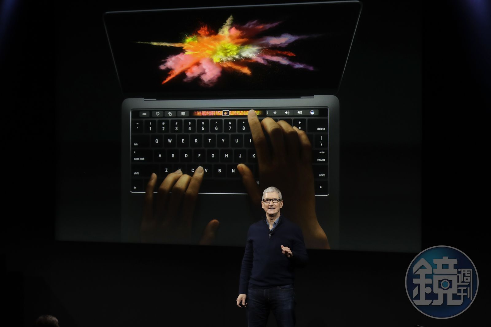 使用OLED觸控螢幕的全新觸控條Touch Bar,是這次新機最大亮點。取代傳統鍵盤上方的一系列功能鍵。使用者可以根據你正在進行的工作顯示合用又熟悉的工具,比如使用Line或者FB時,可以自訂表情符號及關聯字的智慧輸入功能等。