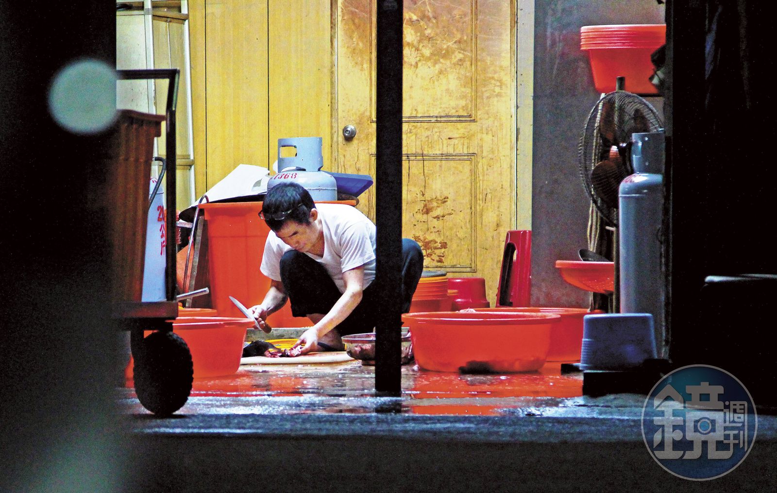 17日當晚9點半,阿華只打開鐵皮倉庫的部分鐵門,進到裡面點起一盞白光日光燈,室內堆疊大量用來清洗魚肉的橘色塑膠桶。