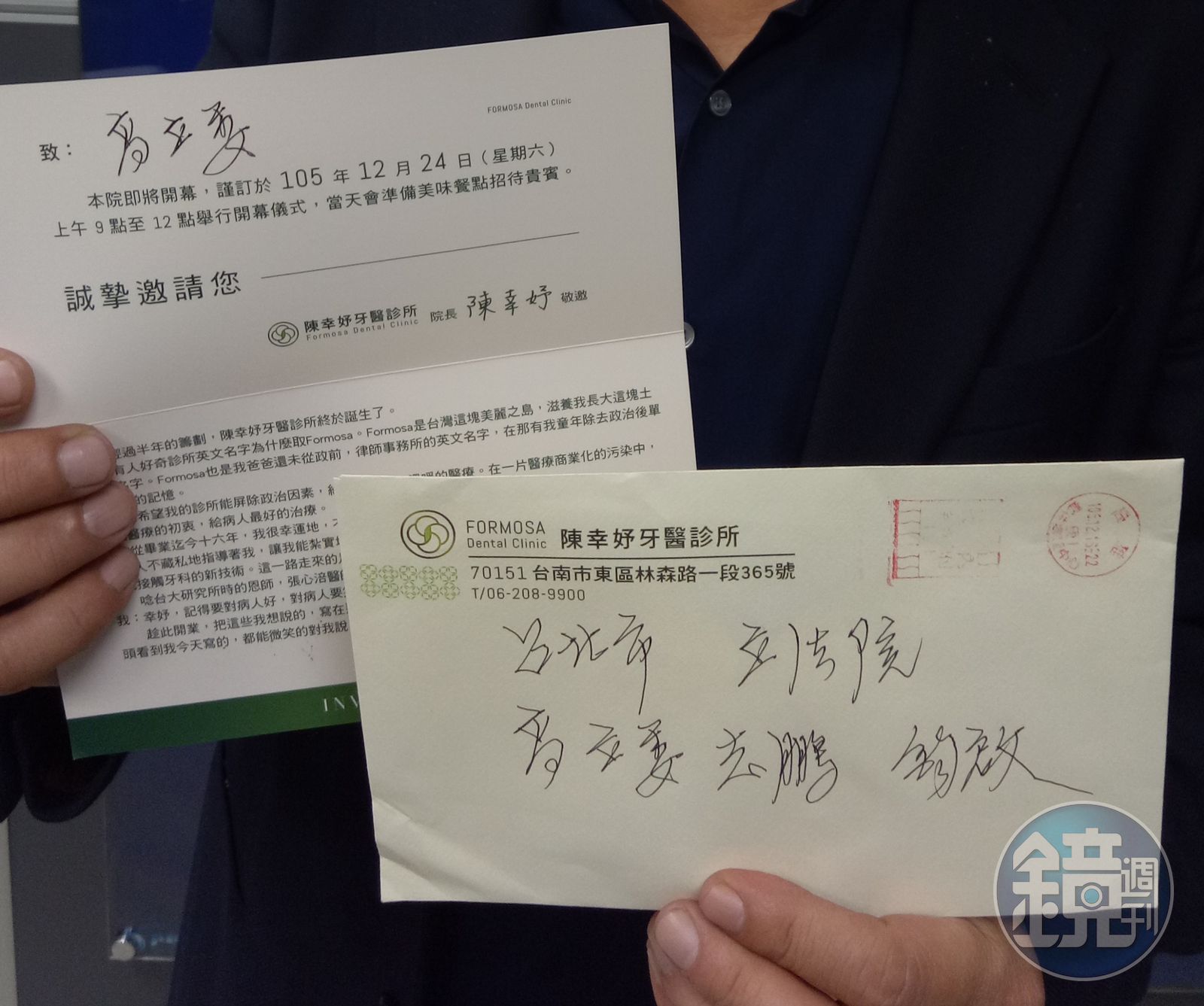 高志鵬的助理說,之前已有專人送陳幸妤牙醫診所的邀請函到該辦公室,這封阿扁親筆筆跡的邀請函是從高雄寄出,可見是阿扁特別花心思撰寫的。