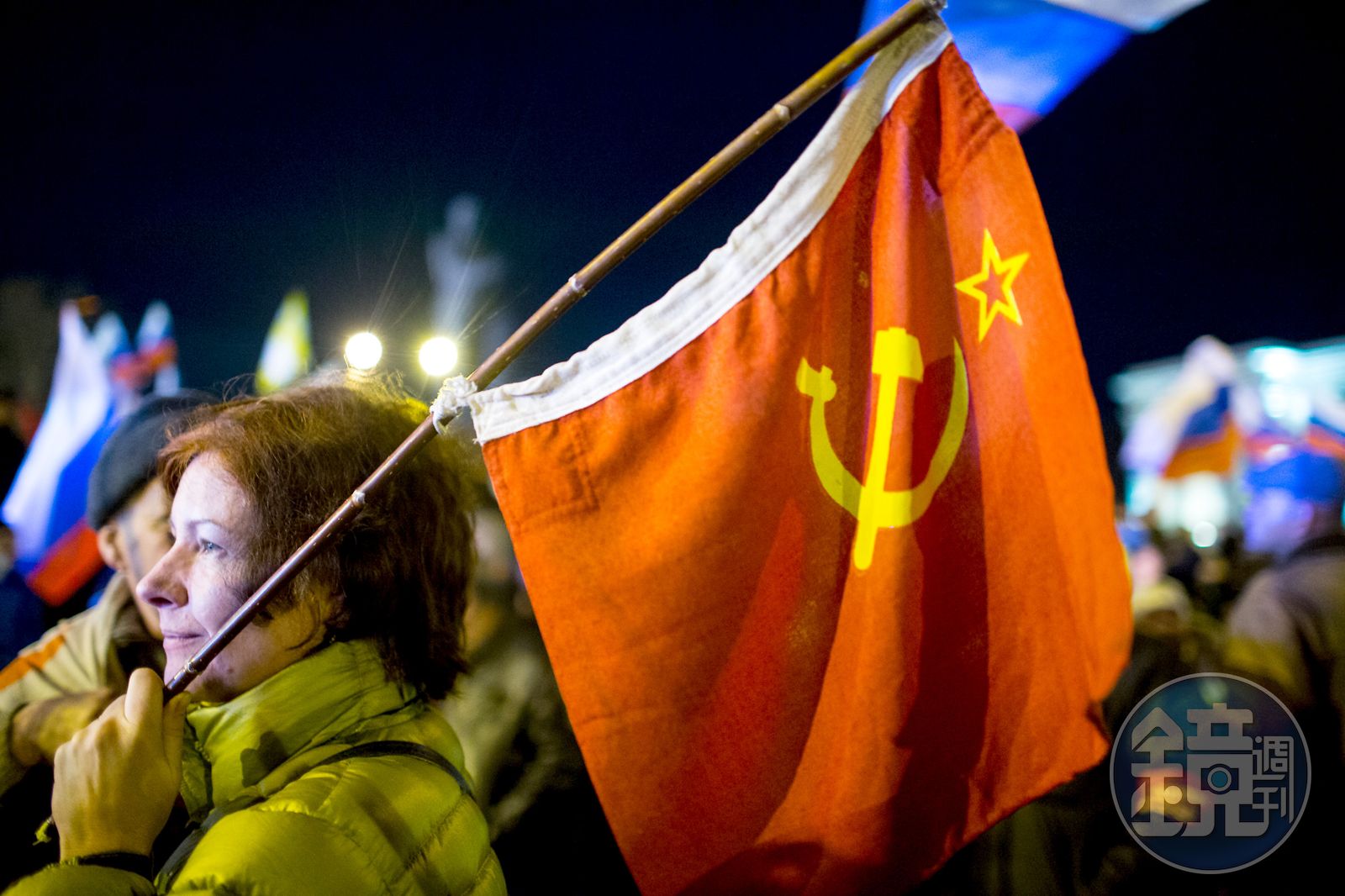 強勢的普丁曾說,蘇聯垮台是「本世紀最大的地緣政治災難」,他至今仍享有讓西方領導人羨煞的超高支持度,據Levada的民調,11月間,普丁的滿意度達86%。他在處理涉及前蘇聯共和國的危機所展現的鐵腕作風,只讓他的支持度飆高,例如當他藐視西方警告,執意兼併烏克蘭的克里米亞半島之際。俄國人力挺的,恐怕也是普丁亟欲恢復的蘇聯昔日榮光吧。(首圖來源: 東方IC 。圖為2014年3月,當克里米亞通過公投,投奔俄羅斯懷抱後,一名俄國女性舉著前蘇聯旗幟,參加列寧廣場的示威。)