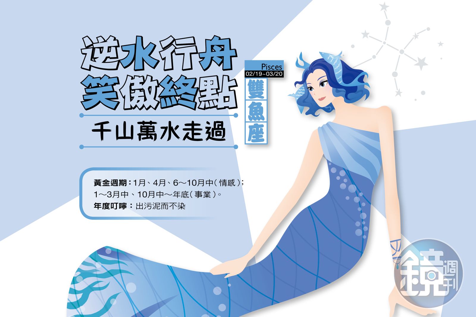 魚座今年事業脫胎換骨、體質調整,是麻雀變鳳凰的「變身年」。以潛水艇模式默默茁壯,從成為團隊中的關鍵零組件,不爭不吵、配合無間,成為不可或缺人物,進而躋身決策核心,當家做主唾手可得。周旋於醜聞弊端、複雜是非與商場機詐間安然無恙,第四季時機成熟,將擇高枝而棲、飛向更廣闊天際。