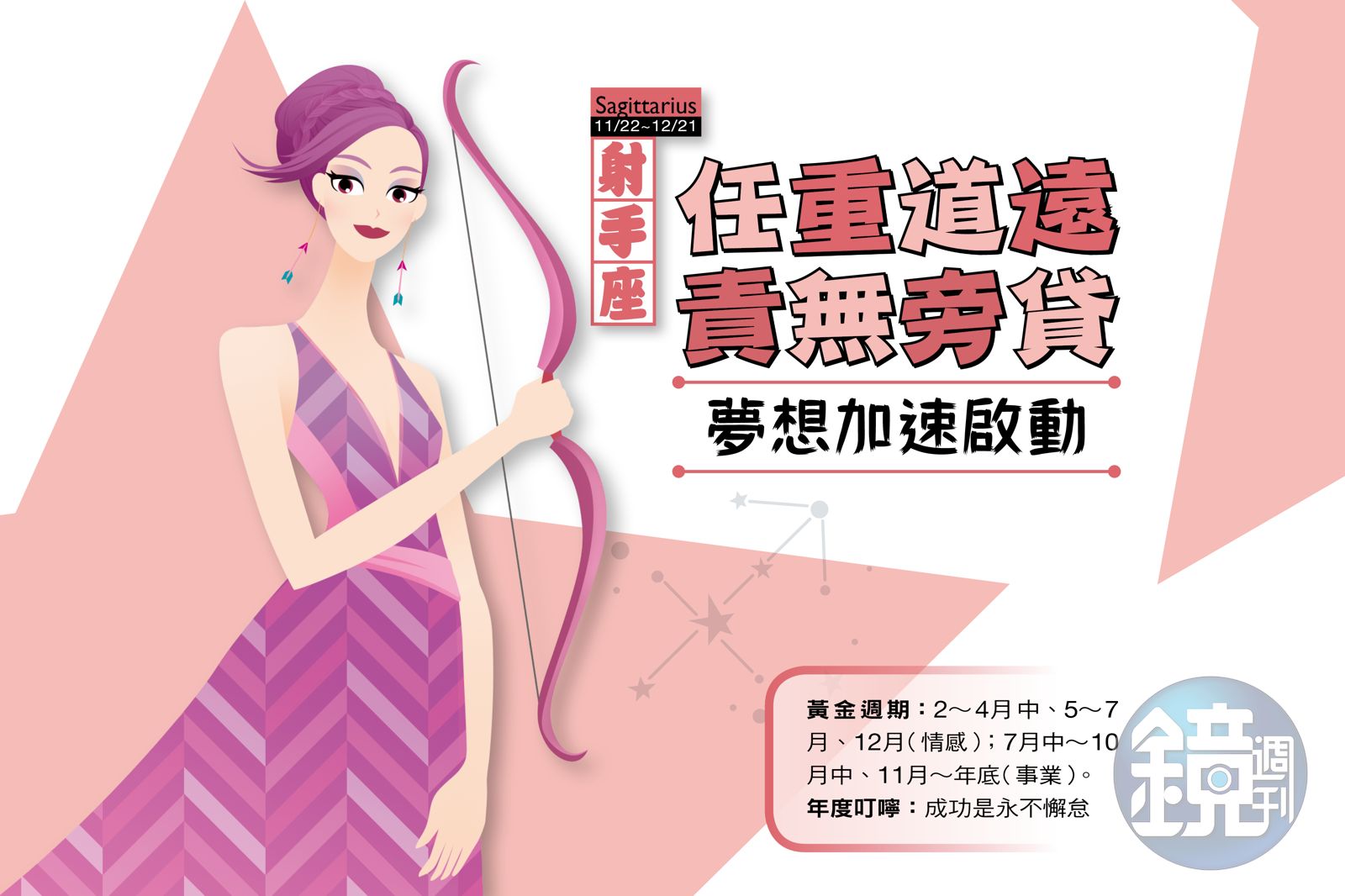 射手今年遵循幸福引力導引,愛的數學式解出最佳答案。因為相信,所以愛。也因為愛,所以幸福。10年一度的守護星木星在象徵定情與廝守的天秤座為期近年的逗留,帶來生命旅伴,是戀人更是知己,心意相通的那種。朋友變情人、陪跑變參賽,甚至成為奪魁要角的奇妙緣分頗多。互許終身、步上紅毯率高。