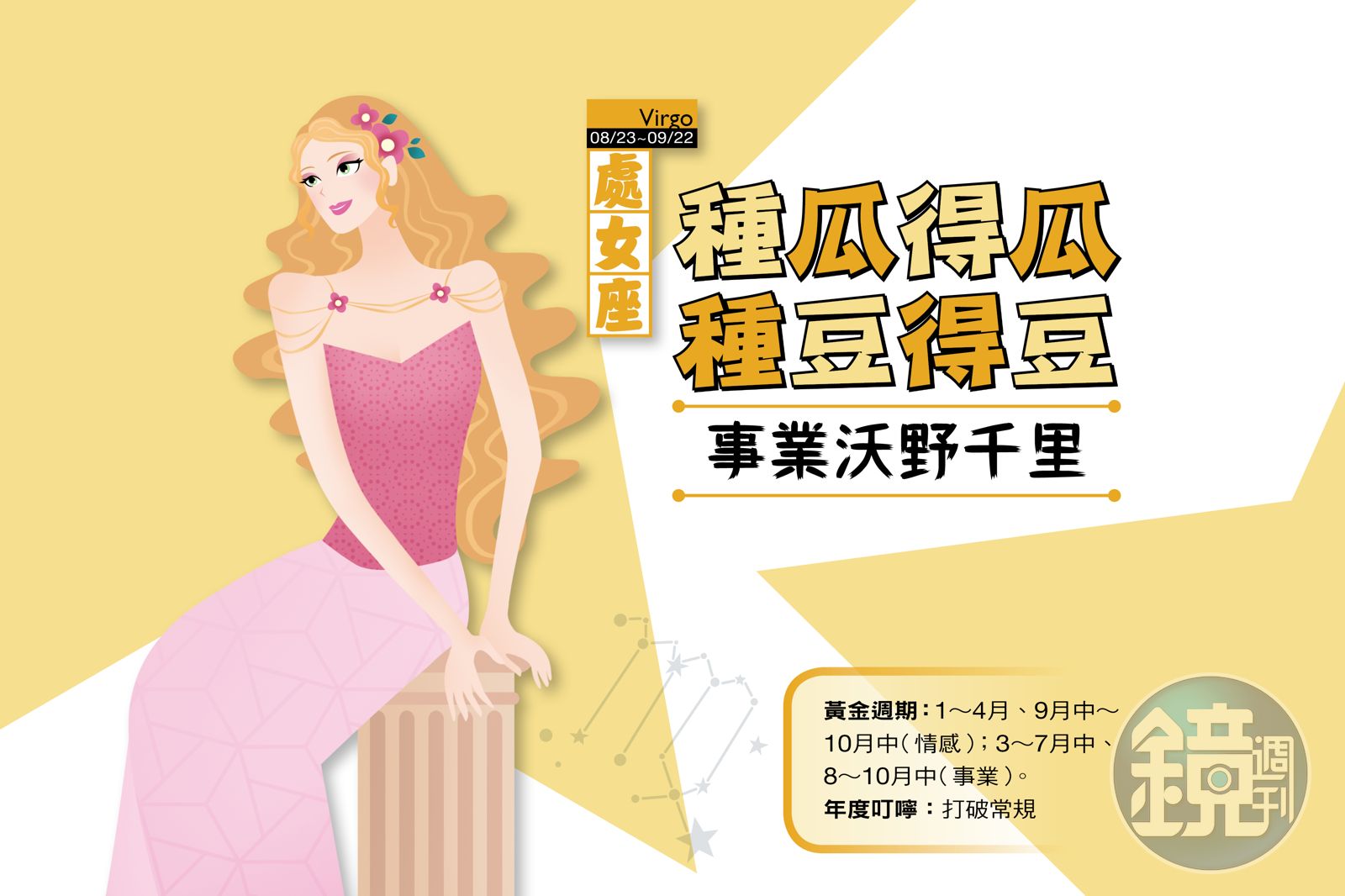 處女今年財運登上10年之最。超吉星歲星在財富宮長達9個月的加持,帶來發達致富、趨吉避凶的推力。財務強化體質、由黑翻紅、轉虧為盈不在話下,耕耘多時的領地也將開花結果,交出傲人成績。除3月初到4月中短暫煞車,全年漲勢可期。健康狀況稍多,注意腸胃、睡眠與情緒,3月初、9月底較脆弱。