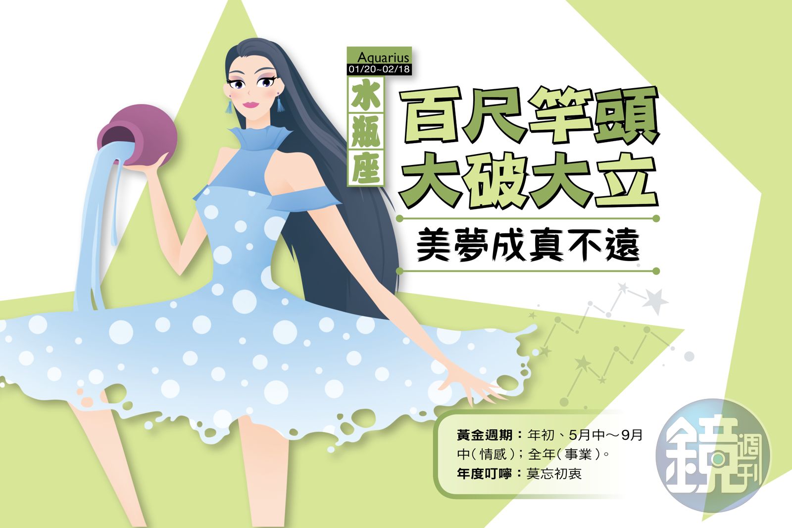 瓶座今年學業事業突飛猛進、節節高升,是贏多輸少的福將。去年殘存的陰霾抑鬱將全數淡出,轉念海闊天空,反有飛向更高枝頭、領銜涉外事務、進修深造獲獎、名揚千里、坐上龍頭的良機。與成功者說著同樣的語言,是出線關鍵。守護星年中退行攻勢稍減,第四季加速權力攻頂,明年有更佳落點。提防損友。
