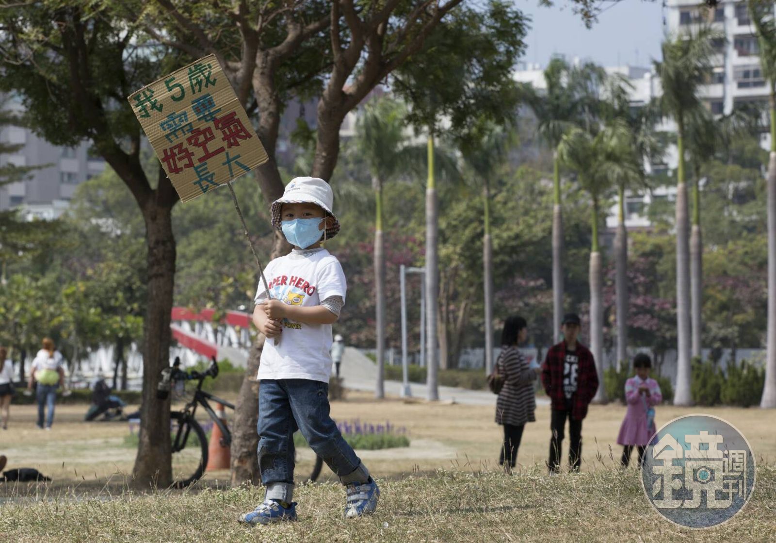 週末的高雄雖然是晴天,但向遠方的天空望去,還是明顯覆蓋著一層灰,一些孩子拿著自己訴求的標語、大人戴著各式各樣口罩齊聚中央公園,抗議日益嚴重的空污問題。