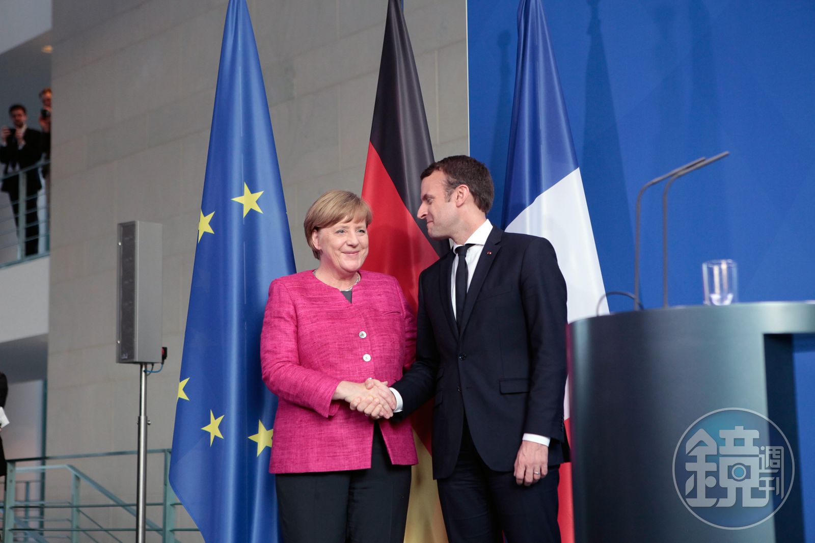 基民黨在德國地方選舉再下一城,總理梅克爾喜上眉梢。圖為她15日在柏林會晤來訪的法國新總統馬克宏。(東方IC)