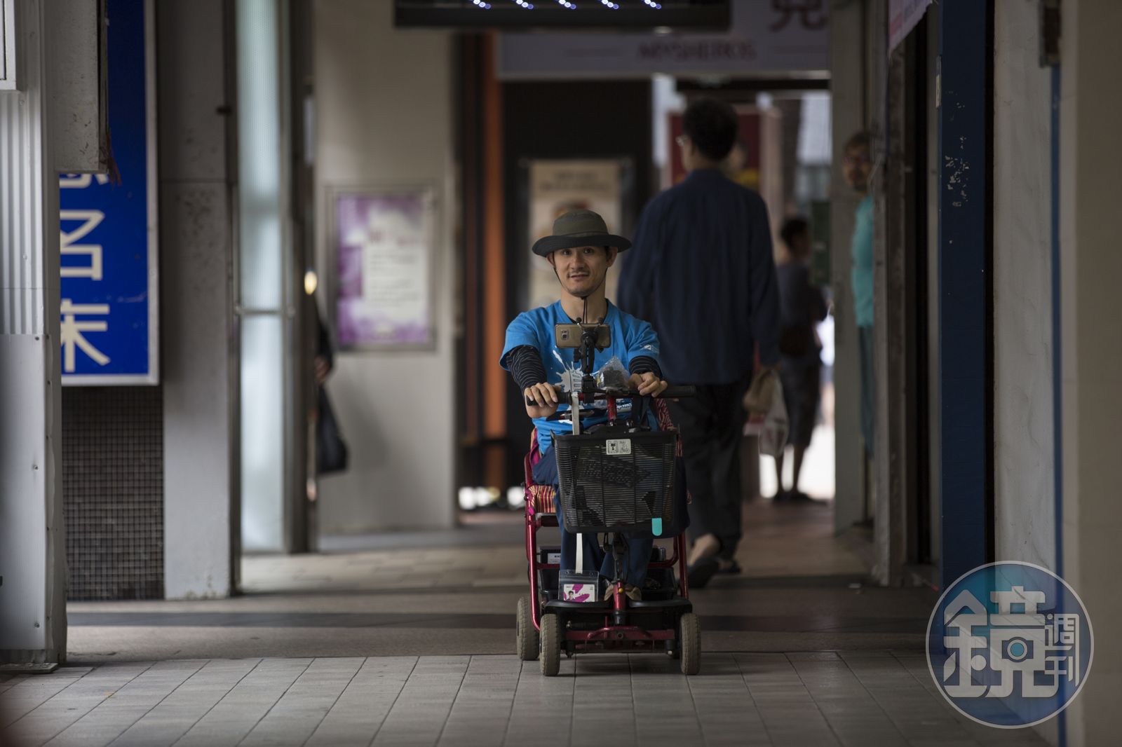 前往遊行隊伍集合處的路上,人行道施工,開著代步車的他過不去,只能折返,下斜坡,行駛於慢車道上。幾輛貨車經過他的身邊,看起來有點危險,但他神情自若。我問他平常外出遇到阻礙,會覺得困頓嗎?他說:「還好,習慣了。」