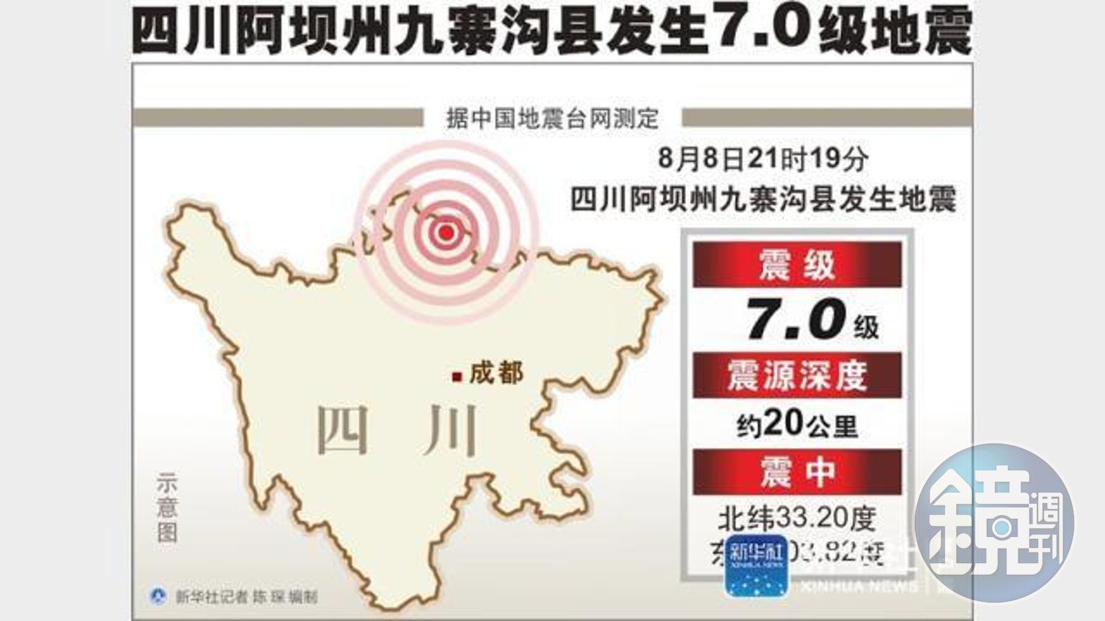 根據中國地震台網快訊指出,就在今晚9時19分四川阿壩州九寨溝縣附近發生規模7.0的地震,附近城市蘭州、成都、重慶、綿陽和西安等地都可感受到地震的劇烈,當地許多居民都嚇得拔腿衝到戶外,截至目前為止,尚未傳出明顯的傷亡情形。