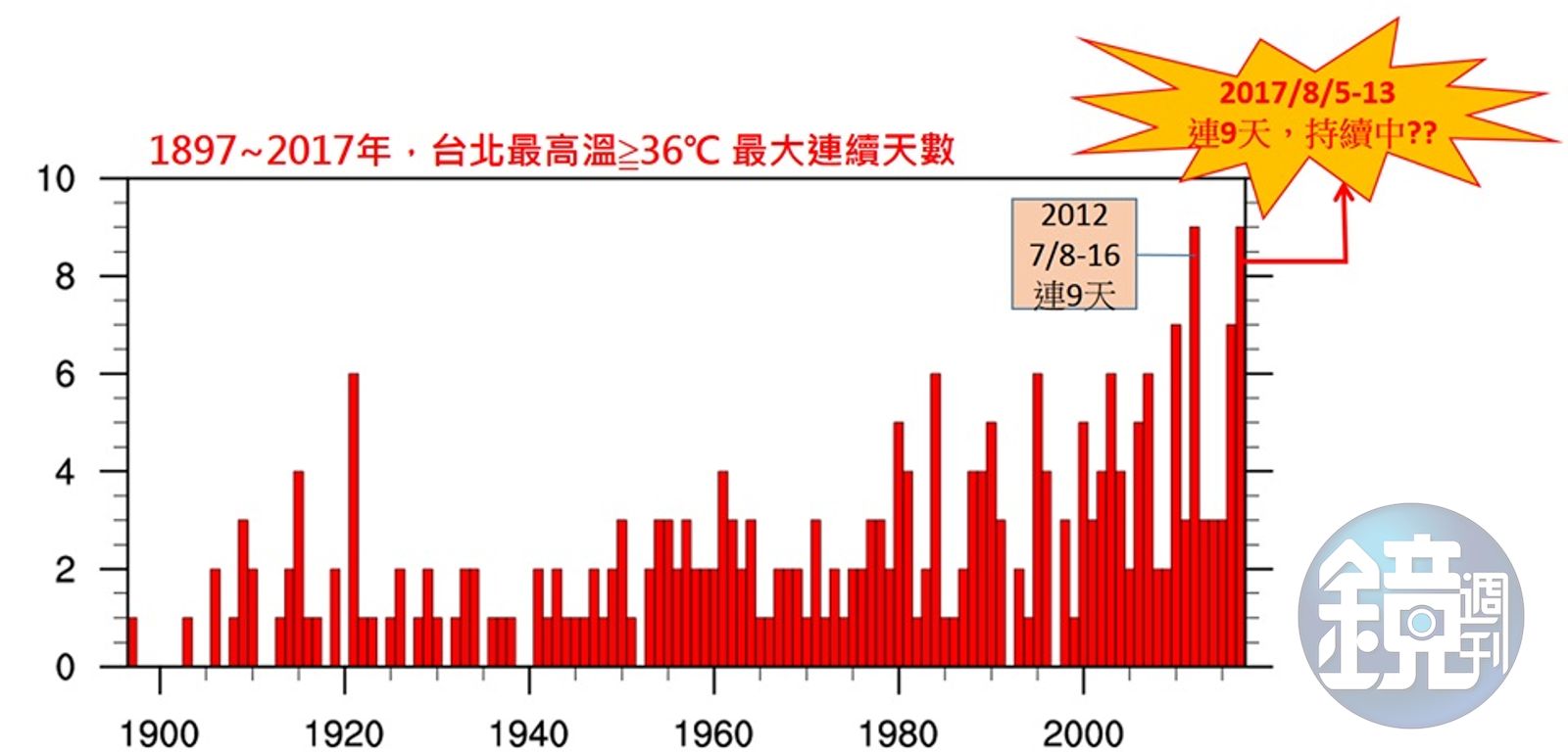 根據中央氣象局的統計,台北已經連續第十天出現超過36度高溫,已經刷新120年來的紀錄。(中央氣象局提供)