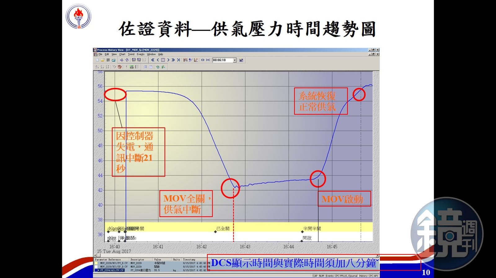 中油副總方振仁指出,因更換短路造成斷電後,自動控制系統察覺異常立即啟動「關斷電動閥」,而且是最關鍵的兩個電動閥,讓天然氣僅剩計量站到大潭電廠之間的管線約600公尺的量,但僅兩分鐘時間,供氣壓力從接近56驟降至42,因此造成大潭電廠跳機,即使立即啟動供氣也為時已晚。