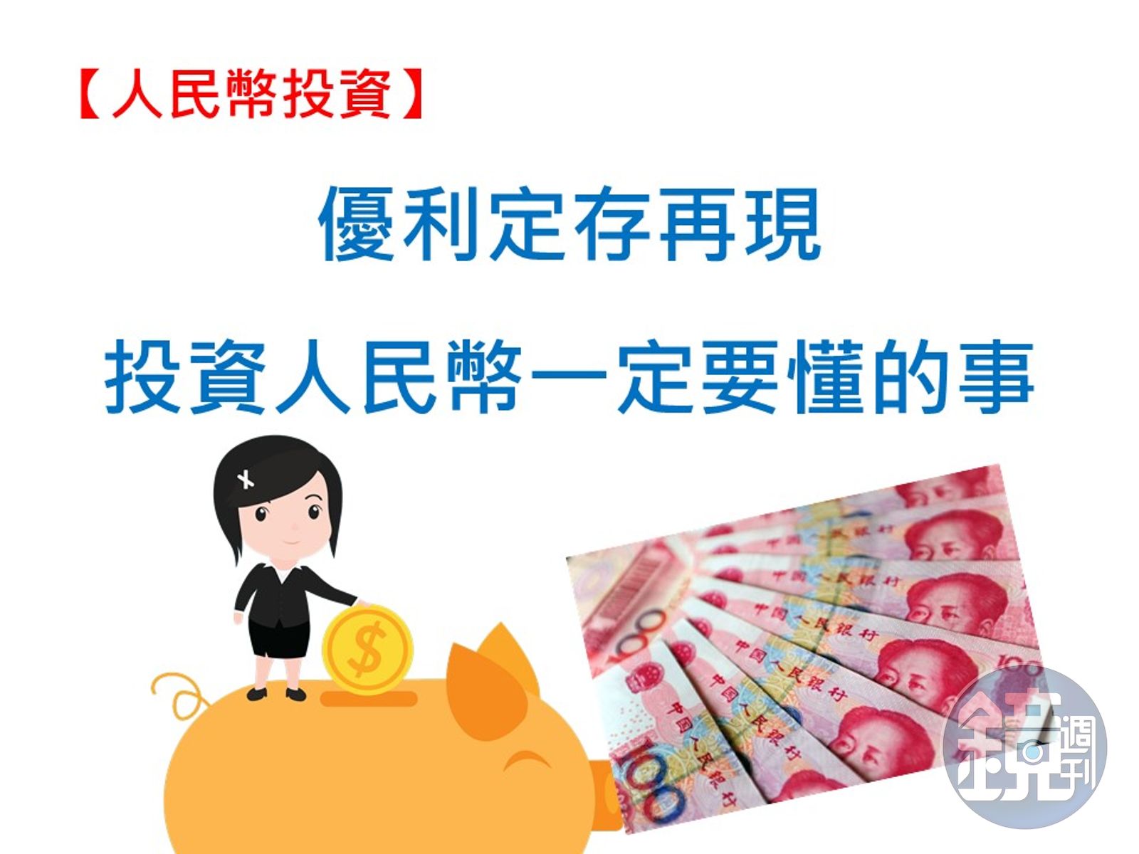不過,隨著市場對人民幣走強預期,目前土洋銀行包括台北富邦、台銀、大眾銀、花旗、渣打等,都祭出優利定存方案,以6個月來說,平均都有3%以上的利息。