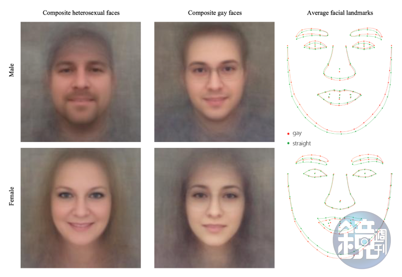 研究員科辛斯基(Michal Kosinski)和王怡倫(Yilun Wang,音譯)利用「深度神經網絡」擷取影像特徵。研究發現同性戀男女往往有「非性別典型」(gender-atypical)的特徵,它們的數據也呈現幾個趨勢。例如男同性戀和異性戀相比,下巴較窄、鼻子較長、前額較大,而女同性戀比起女異性戀下巴較寬、前額較小。