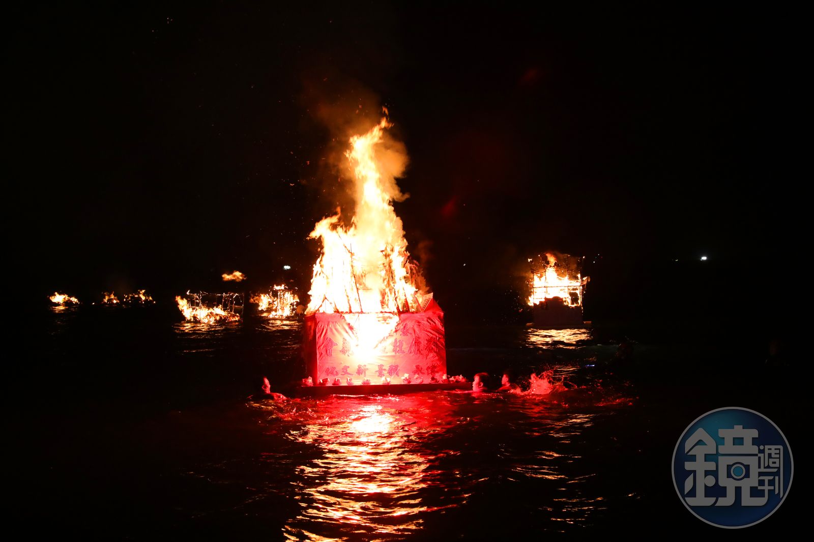 熊熊火焰在夜晚的海上格外明亮。
