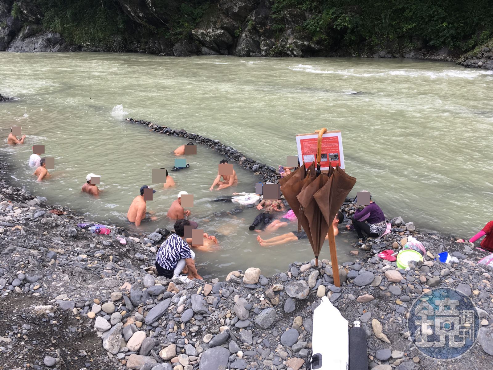 記者實地來到民眾指稱的水利署護岸工程聯絡道,入口處立著一個木製告示牌,新北市政府表明該處是水質保護區,自9月19日起禁止民眾擅自進入或使用溫泉,並擺設了大型水泥塊阻擋車輛,不過仍擋不住民眾以步行方式進入遊玩。