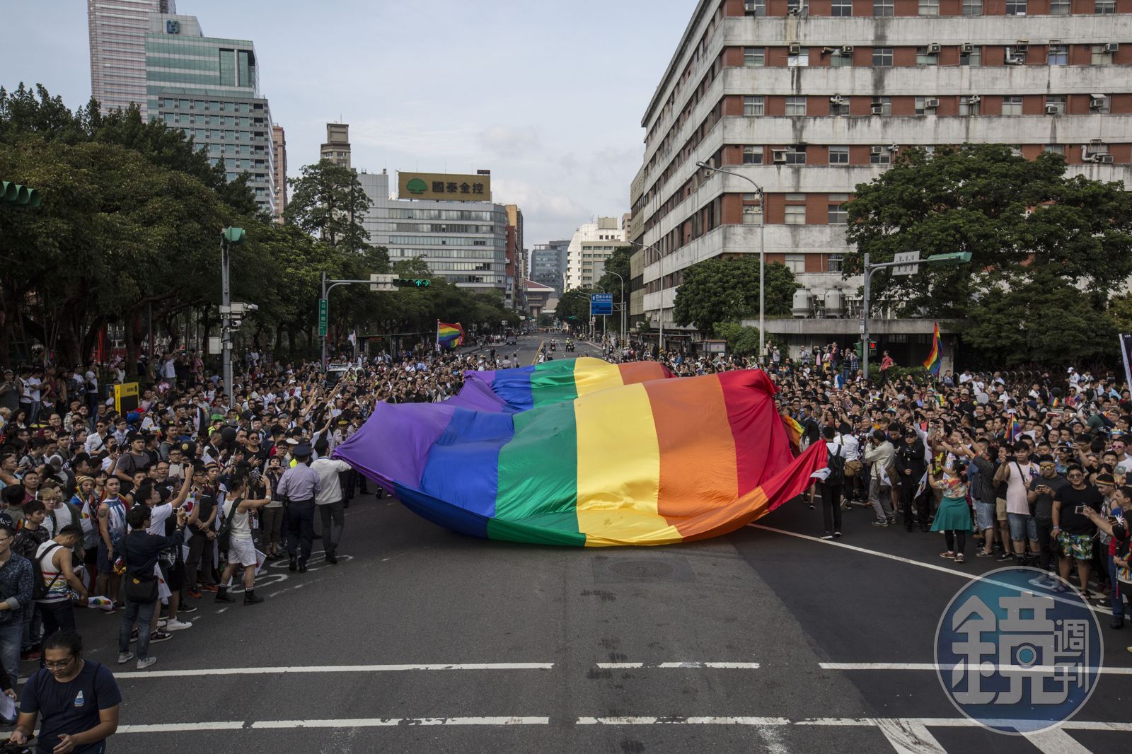 今天下午台北放晴,走出來參與遊行的民眾會比預期多,主辦單位預估今天這場遊行可以號召11萬人上街,總計也有20個國家的同志團體來台參與這次的遊行,大約今天16時40分的時候,3條遊行路線將會匯集至凱達格蘭大道上。