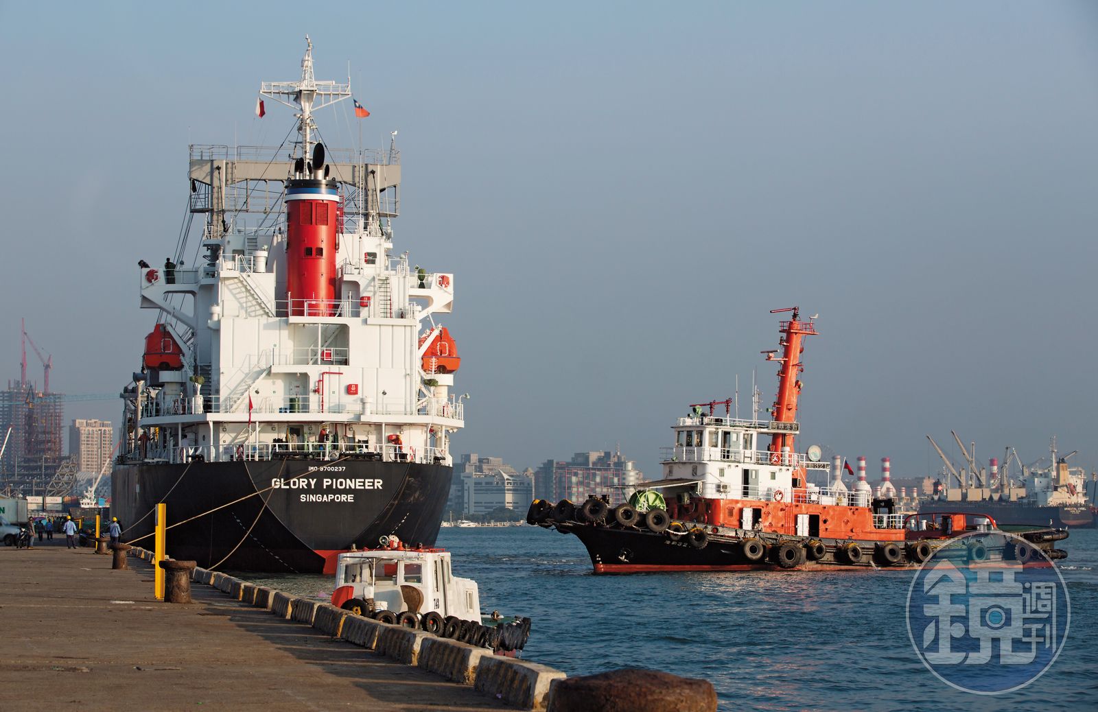 11月7日早晨,二艘拖船拉著大型貨櫃輪緩緩進到高雄港,這樣的場景每天都在高雄港出現,碼頭工人告訴本刊,大型船舶馬力大又不靈活,進入狹小的港口航道前就要先關掉動力,改由拖船將大船拖進港停泊。