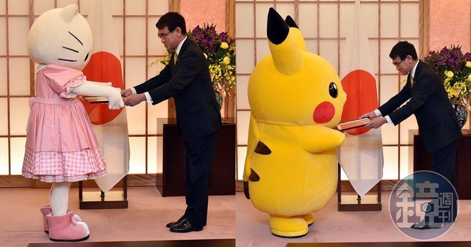 日本外務大臣河野太郎在本月28日,任命風靡世界的「凱蒂貓」與電玩角色「精靈寶可夢」為2025萬國博覽會的拉票大使。在當天舉行的任命式上,他還親自向他們(「寶可夢」的代表為皮卡丘)頒發外務省的任命證書。凱蒂貓和皮卡丘也揮手,向與會者強調會努力以赴。