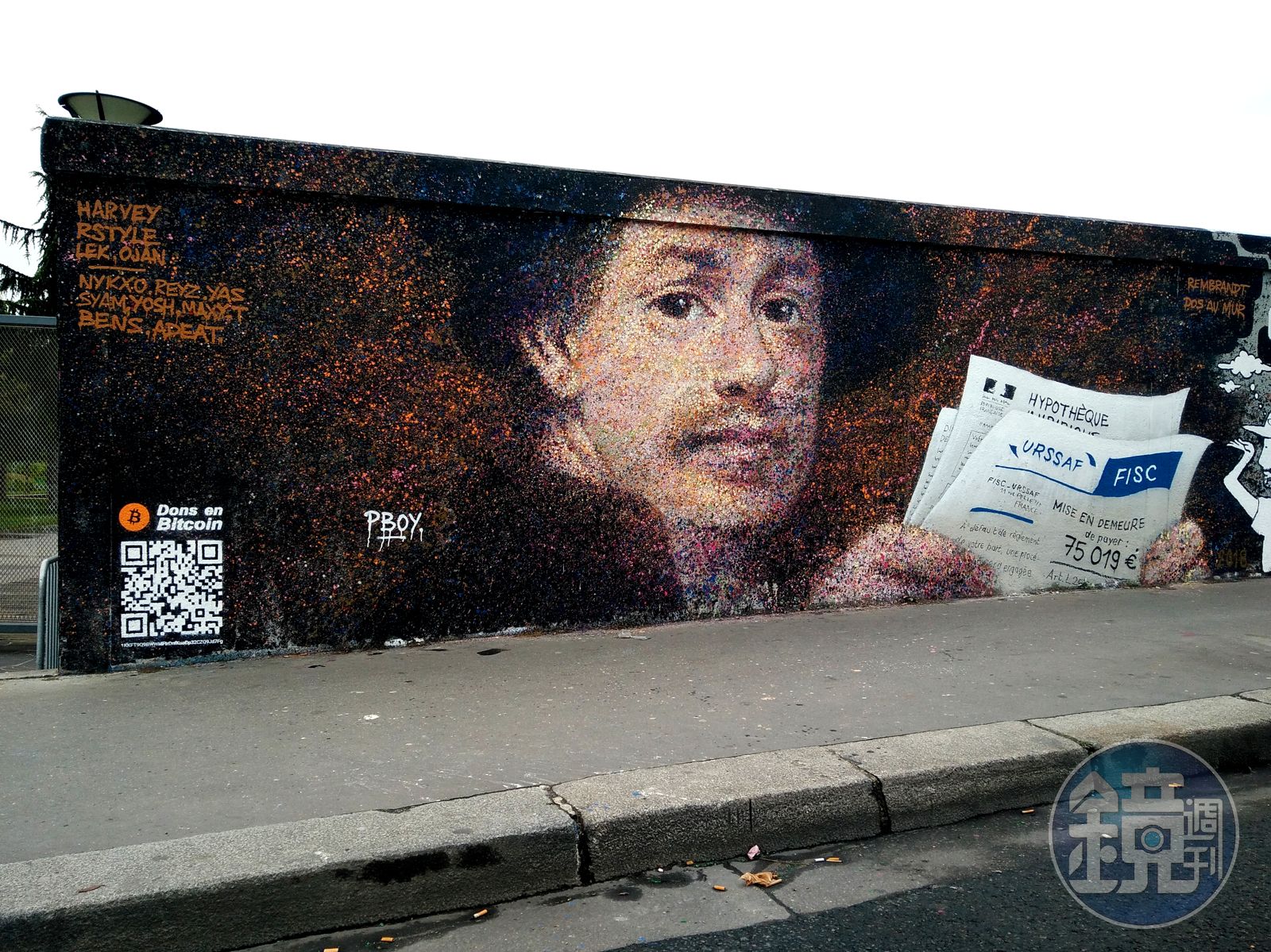 綽號「PBOY」的法國街頭畫家波亞特,應該是全球第一個首創這種賺錢方式的藝術家。他最近的一幅作品位於巴黎里格路一座路橋上,畫作主題正是巴洛克繪畫大師林布蘭,不過畫中大師手中多了一份報稅單,眼裡流露無奈,作品名稱叫做《被逼到牆角的林布蘭》,一語雙關點出了古今中外幹藝術這行的,不論多有才華,都常為金錢所困。