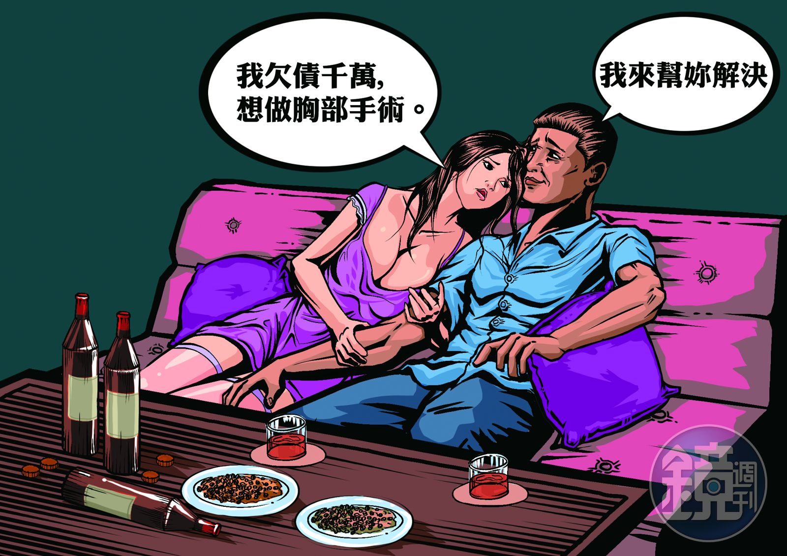 2015年1月,小婷向港商吉米說,不少酒客到店裡消費欠帳,得由她先代墊付款給公司,酒客若沒清償,就由她認賠,以前她做小姐會「出場」,還錢很快,但她受不了每天出場轉做幹部,還錢速度變慢,多年來利滾利,加上卡債及2次胸部手術所花的錢,已欠下六百多萬元債務。