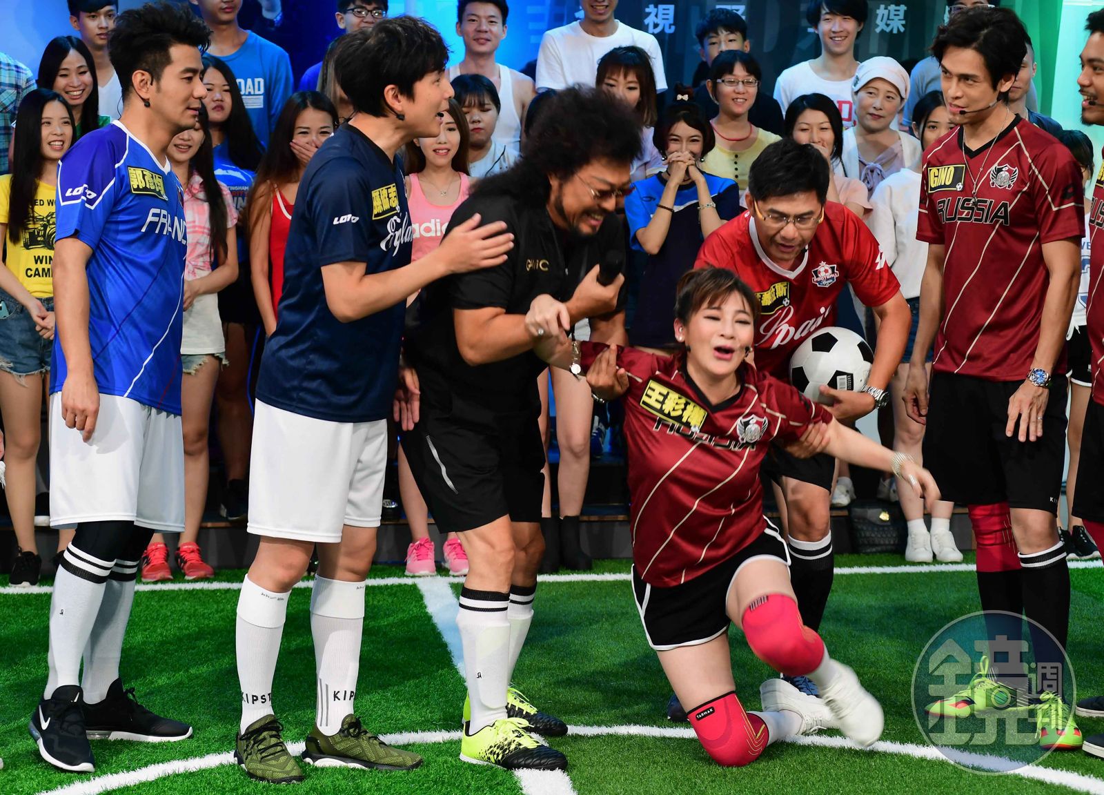 《綜藝菲常讚》組成「明星足球隊」pk拿獎金,王彩樺「內馬爾滾」出場滾至菲哥腿旁,抱著菲哥大腿嬌喊:「我要當裁判長的情婦!」(華視提供)發布時間:2018.07.13 20:16 臺北時間