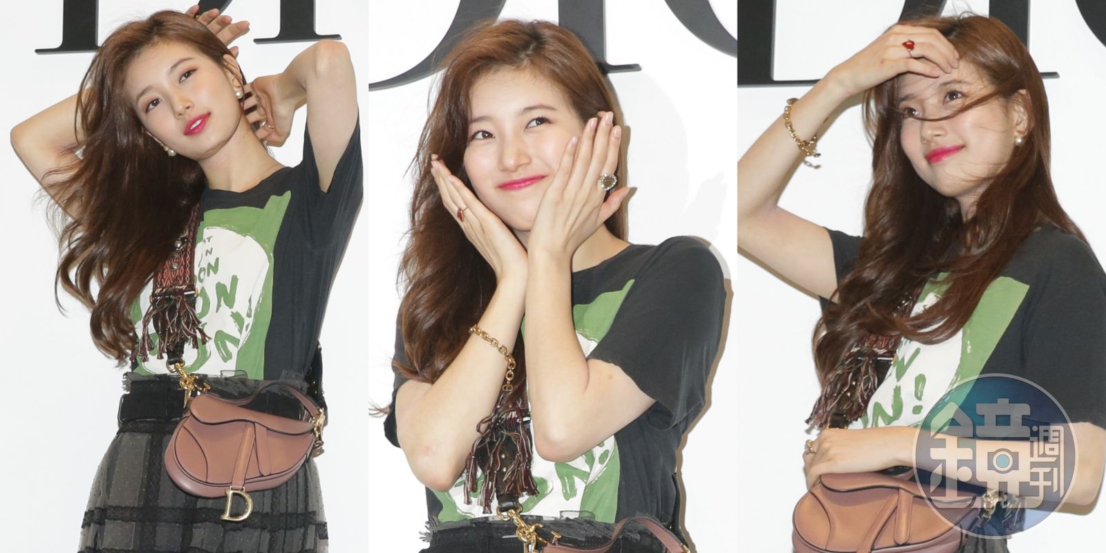 秀智身穿Dior T-Shirt,NT$25,000、灰色蕾絲格紋褶裙NT$210,000、黑色內襯褲NT$32,000、J’adior羊毛格紋高跟鞋NT$31,000、Saddle玫瑰粉色包款NT$82,000。