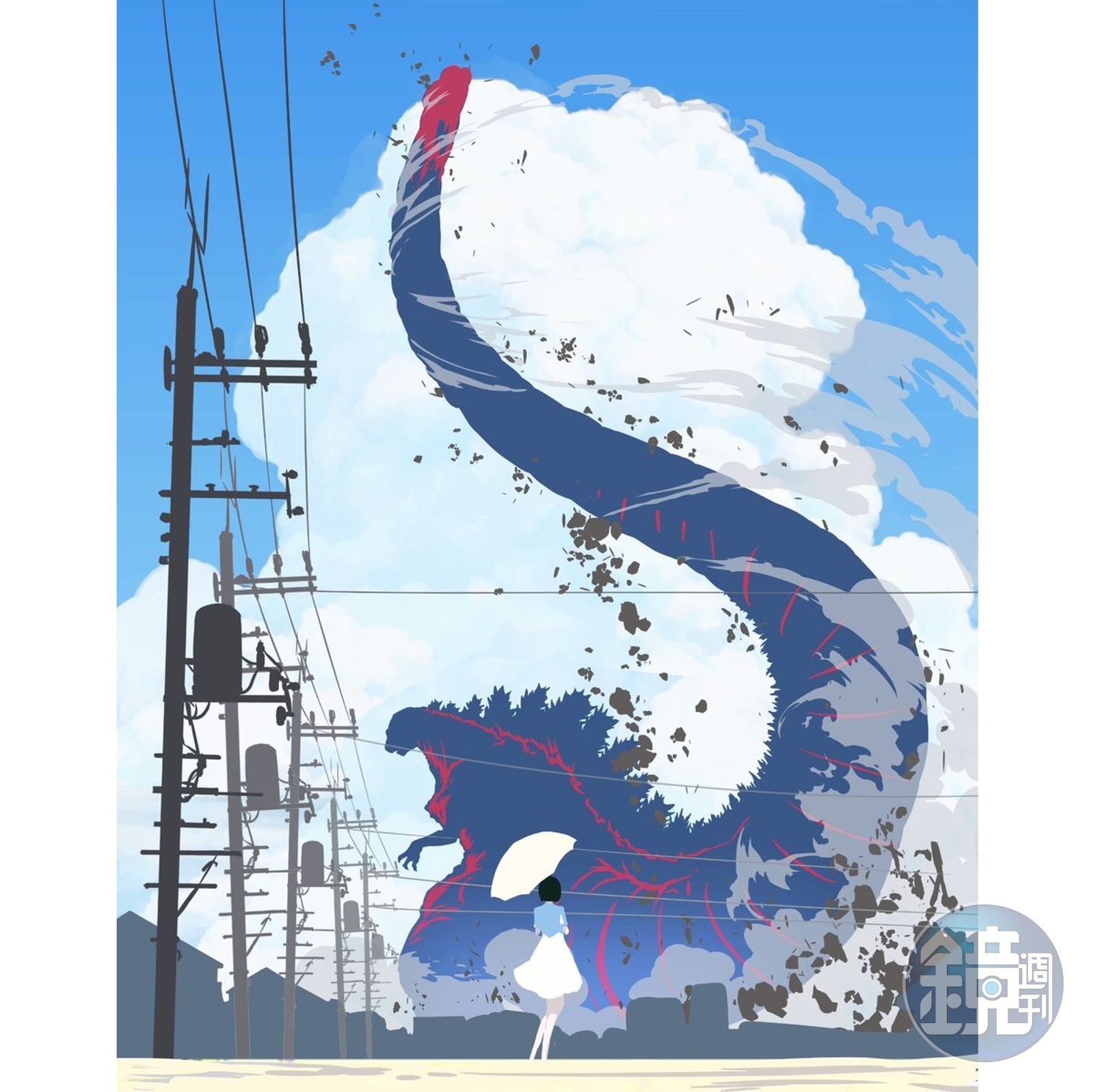 一個撐著洋傘的女人,看著一個遠方頂天的巨大的怪獸「哥吉拉」,用尾巴揚起由樹木與塵土形成的煙霧。