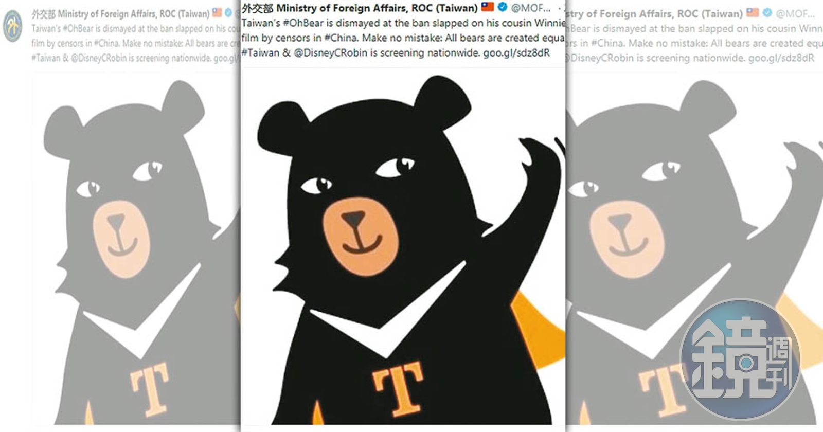 美國迪士尼動畫《小熊維尼》真人版電影《摯友維尼》近日在台上映,但在大陸卻沒拿到放映許可,外界推測可能是因中國國家主席習近平被網友比喻為「維尼」有關。對此,我外交部在推特放上吉祥物「喔熊」的圖片表示「凡熊在台灣生而平等」,被CNN解讀為嘲諷中國,該則推文在8日晚間悄悄下架。