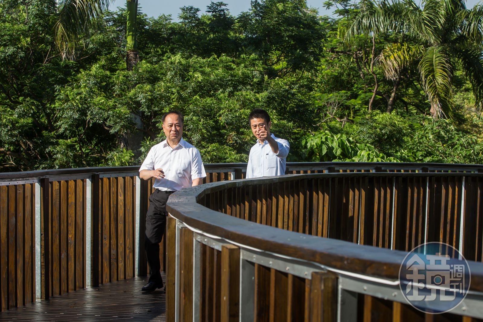 依偎木棧道旁的露天泳池剛完工,張學舜興奮地帶大家到泳池邊休憩區喝茶,看到不足處立刻交辦同事說:「這個角落還要再放一支風扇。」秀出改造前的照片,他滿臉驕傲,「你無法想像這裡原本是鐵皮屋,我們只花10天改造,留著原本的支架,加上透光玻璃,取名『坐望林』,因為看出去是一片樹林,很有南洋風味。」