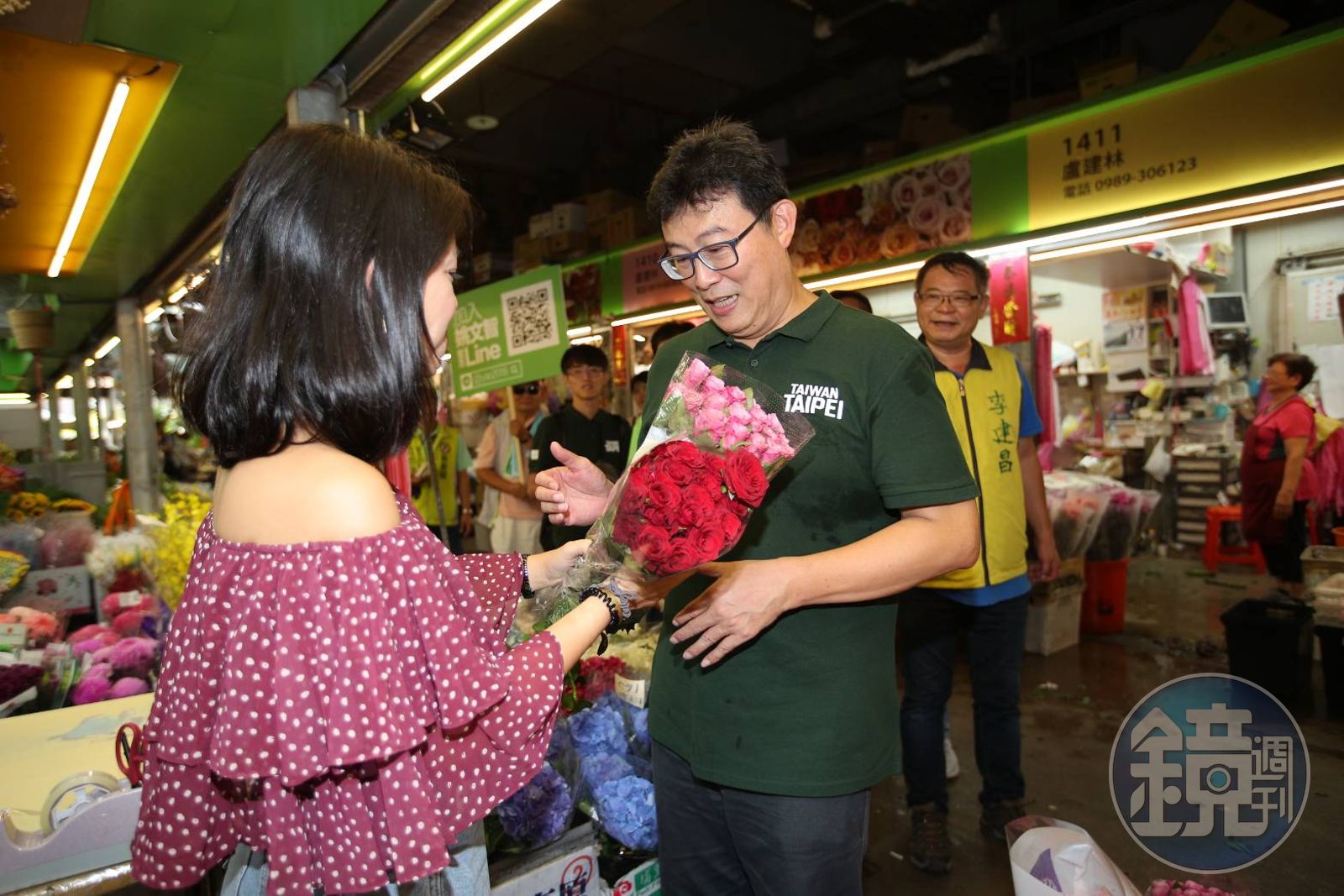 姚文智邊拜票邊挑選好幾束花打算送給老婆,他還透露,老婆很擅長插花,所以他買的花也許老婆不一定滿意,但老婆一定可以發揮她的功力。