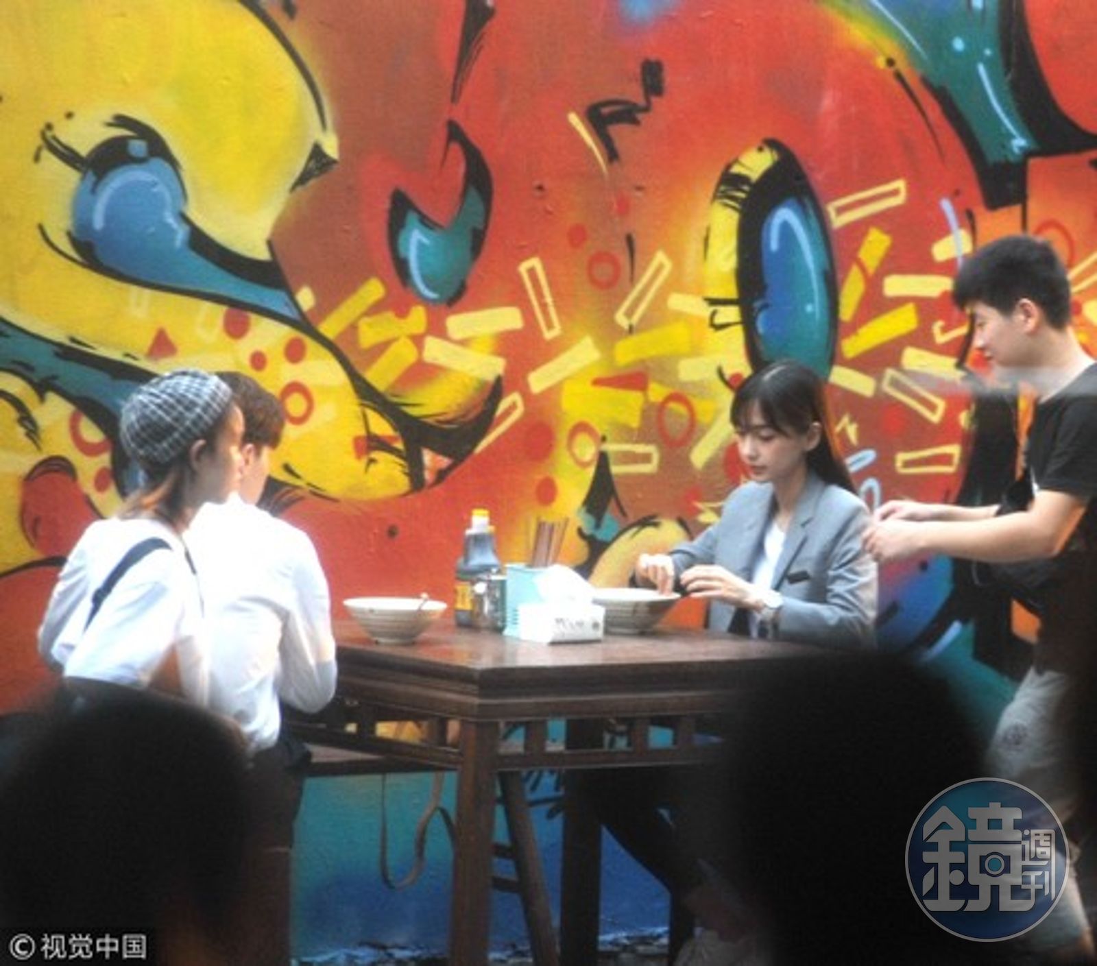 近日有網友在微博放上Angelababy偷拍照,只見她流著妹妹頭,穿著灰色西裝外套配白T恤、九分褲,率性坐在路邊小吃攤大口吃麵。不僅如此,Angelababy身邊男伴竟然不是黃曉明,而是新生代鮮肉鄧倫,不過仔細一看,2人原來是在拍攝新戲《我的真朋友》,而戲裡他們在吃完飯後,還共撐一把傘在雨中嬉鬧,走一種浪漫天真小情侶路線。
