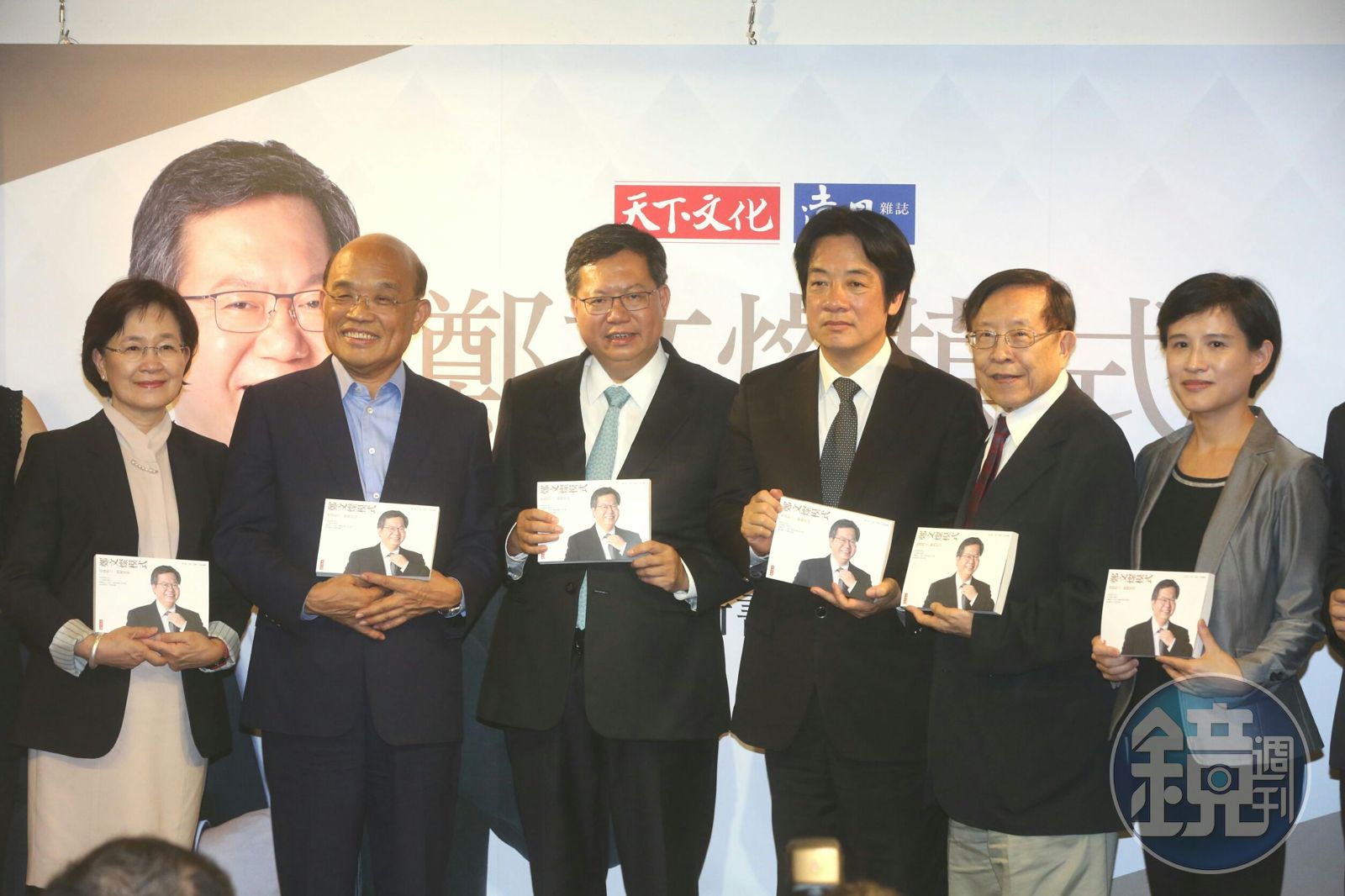 賴清德說,他看到書中鄭文燦的歷任長官都以汽車廣告詞「好用、耐操又省油」來形容鄭。但他只有2個字「厲害」,因為鄭要預算時,講到你不幫忙都不行,聽起來像是他幫我們解決問題,所以桃園的鐵路地下化、機場捷運延伸到中壢等工程都給他了。