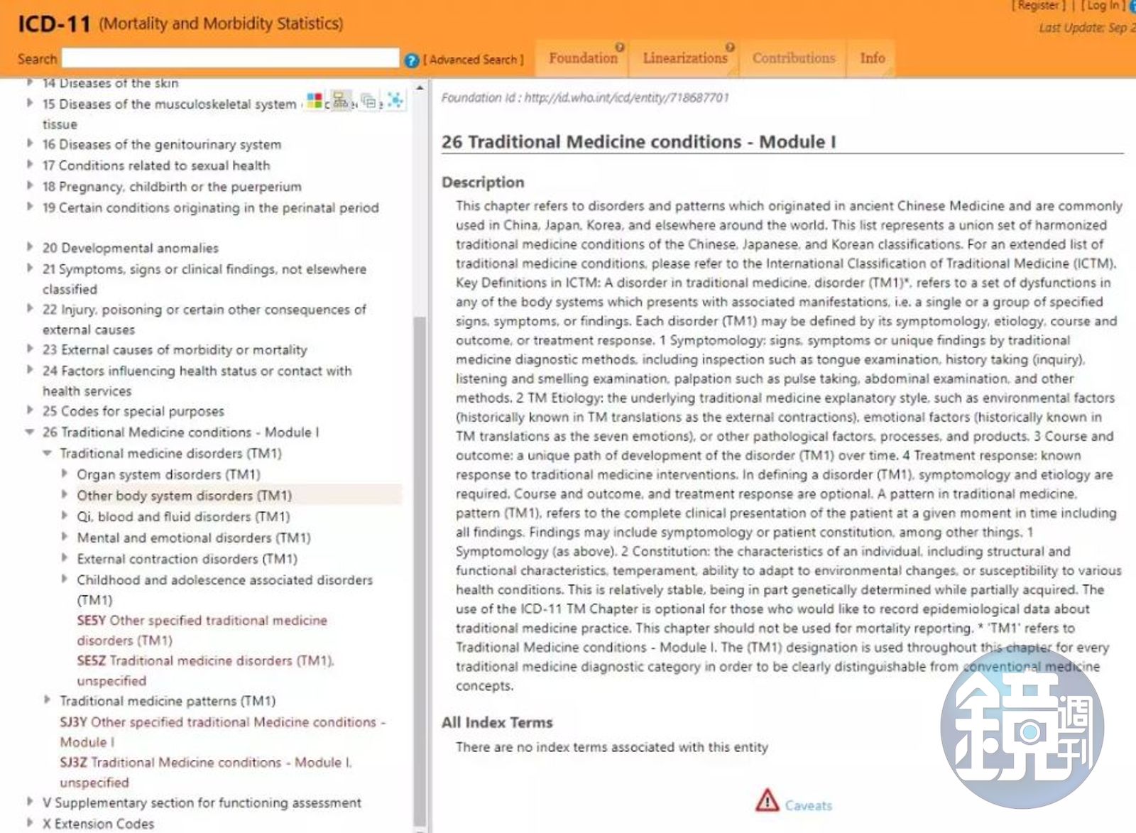 在今年6月18日發佈的國際疾病與相關健康問題統計分類第11次修訂(ICD-11)的預覽版中,傳統醫學中的一些疾病分類首次被納入其中,其中包括多種傳統中醫定義下的疾病如氣虛、濕熱。這反映出了中醫在世界範圍內產生的廣泛影響。此次修訂將會在2019年5月的世界衛生大會上提交成員國通過,並將於2022年月1日生效。