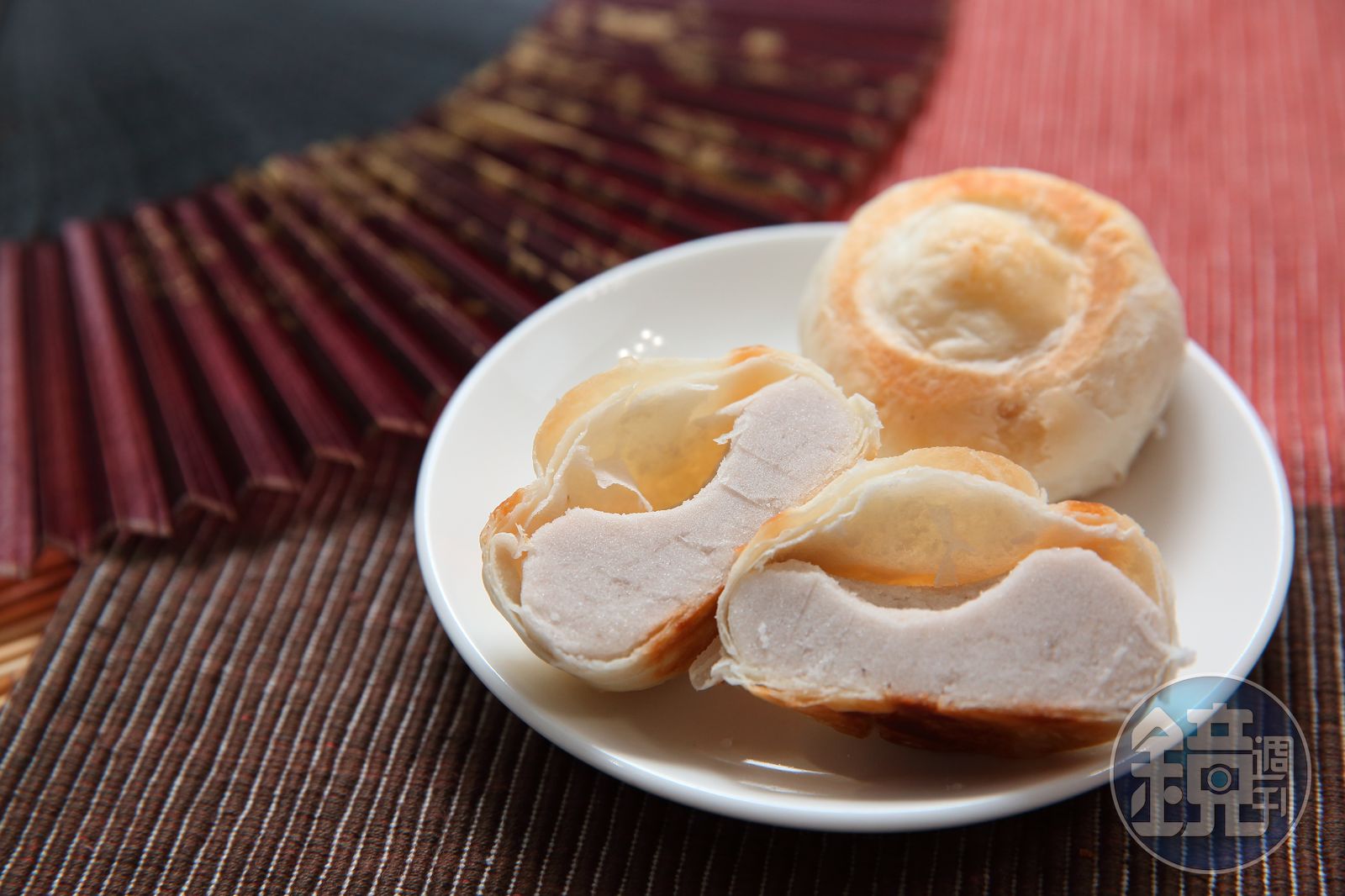 白豆沙的外觀走小家碧玉路線,個頭不大,外皮薄如雪花片片,還有一圈黃澄澄的烤色做印記。一口咬下以花豆作成的內餡,細緻綿密、不致甜膩,意外地沒有太濃郁的花豆味,甚至有點像淡雅的芋頭香。
