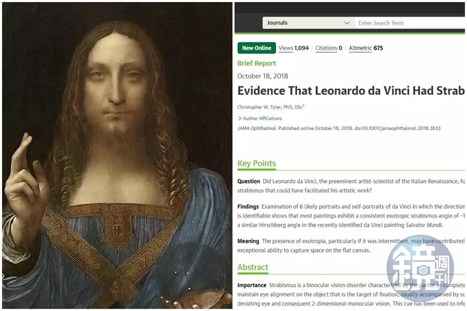 倫敦城市大學的視覺神經科學家Christopher Tyler對包括了《救世主》和《維特魯威人》在內的6件達文西的藝術品進行了細緻的觀察後,於10月18日在美國醫學會眼科雜誌《JAMA Ophthalmology》發布報告稱,這6幅畫中,有5幅畫中人物的眼睛都與外斜視的症狀表現相一致,而這種外斜視將會對患者的立體視覺產生影響。