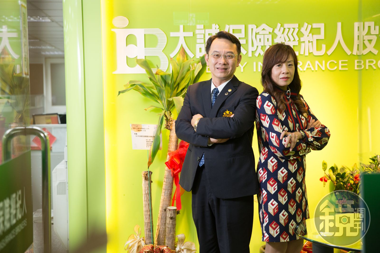 相較於太太擁有典型業務員的活潑健談,王文全內斂許多,初見面不會主動開啟話題,致詞也是長輩級的正經。夫妻倆是彼此的初戀也是創業夥伴,合力帶領大誠保經將去年新契約保費衝到60億元,保單續繳率97%,登錄人力為3,461人,規模從保經界前5大成為第2大,僅次公勝保經,簽約保險公司達32家,為業界最多。