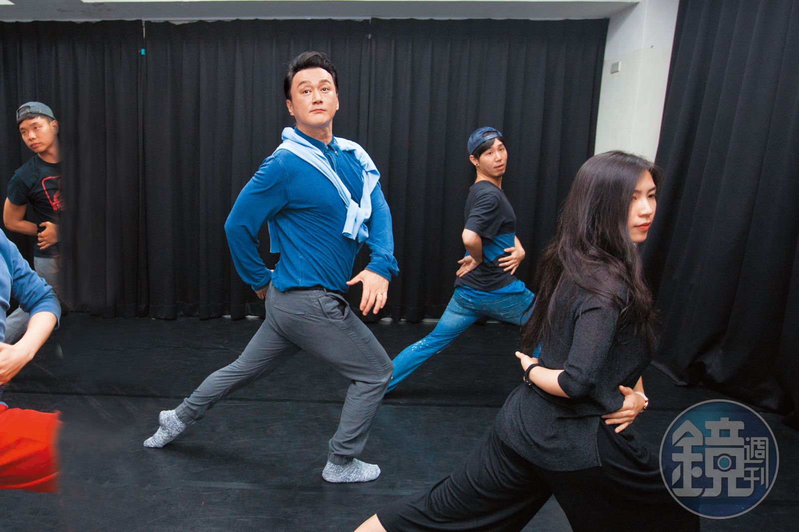 「合舞準備!」春河劇團行政總監郎祖明一聲令下,團員迅速聚集至舞台中央,身材挺拔的何篤霖,無論站在哪個位置,都是全場矚目的焦點。已年過50的他,在2018年中為舞台劇《愛情哇沙米》演出做準備,多變的表情,加上過去硬底子芭蕾舞身段,舉手投足都吸睛,與新生代團員站在一塊,更像是同個年齡層。