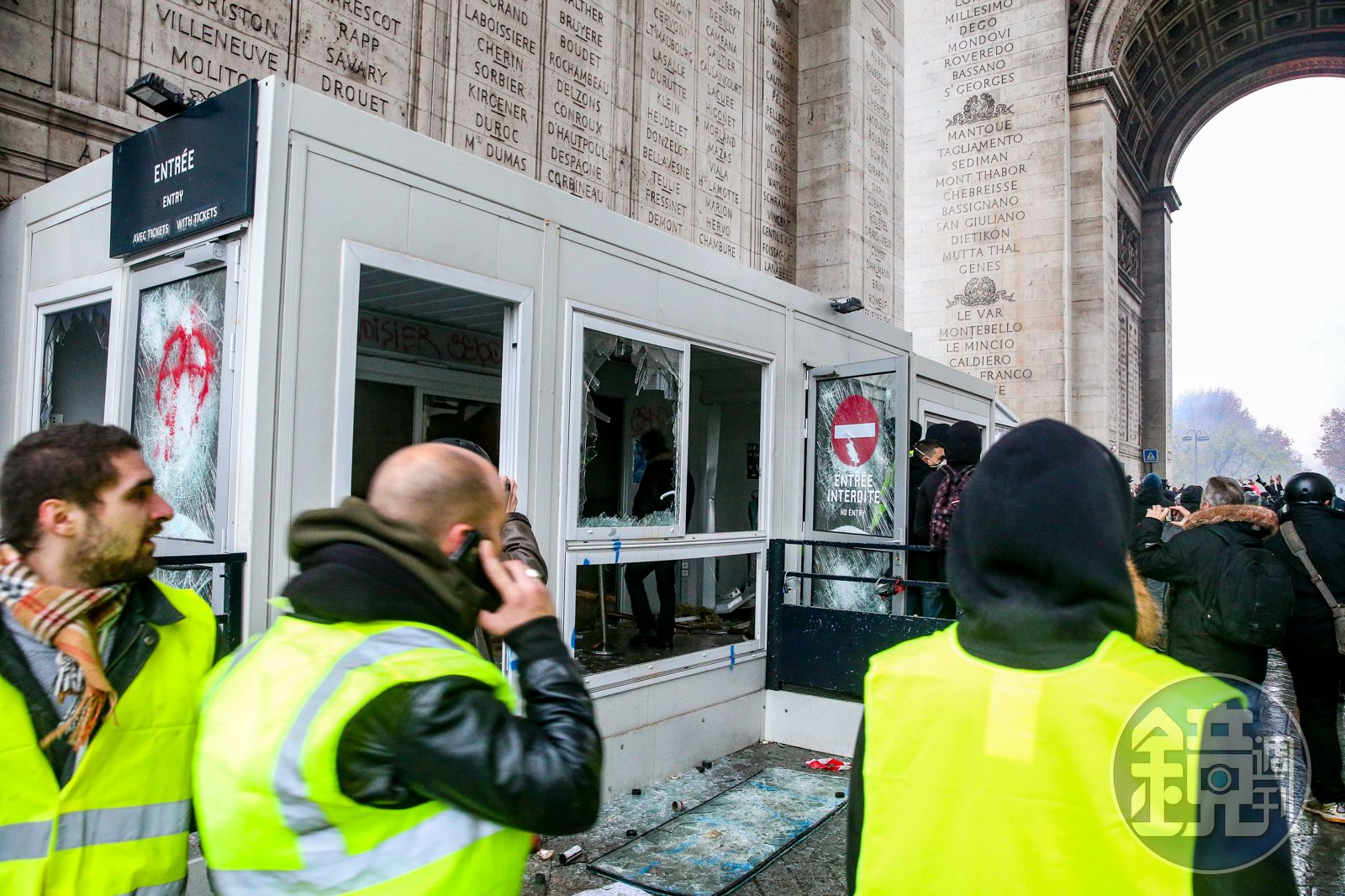 黃背心運動抗議者闖入凱旋門內部毀壞展品。(東方IC)黃背心運動持續三週,法國各地都有人響應,估計全國有28萬人參與。最近一次示威運動在1日,有13.6萬人參與,造成巴黎凱旋門、羅浮宮等知名地標遭噴漆破壞,至少有263人受傷、412人被捕。