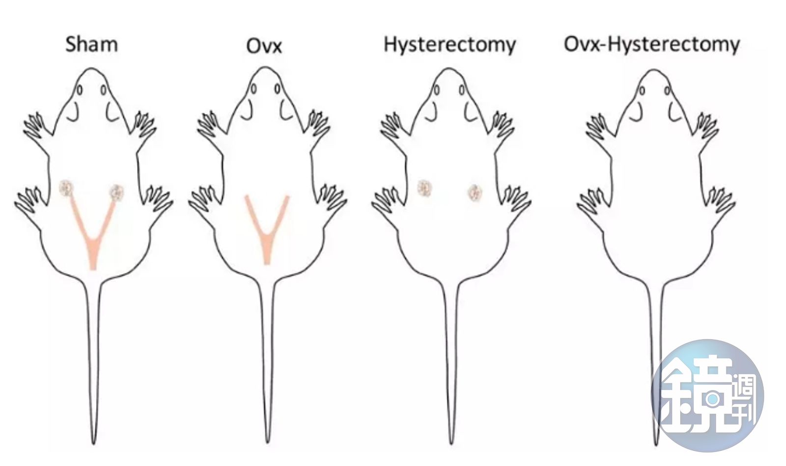 研究小組使用雌性大鼠系統地測試了子宮和卵巢在學習和記憶中的作用。根據絕經手術干預的類型,研究人員將大鼠分為四組對照組:子宮切除,保留左邊卵巢;子宮切除,保留右邊卵巢;子宮和卵巢都切除;假手術,都不切除。