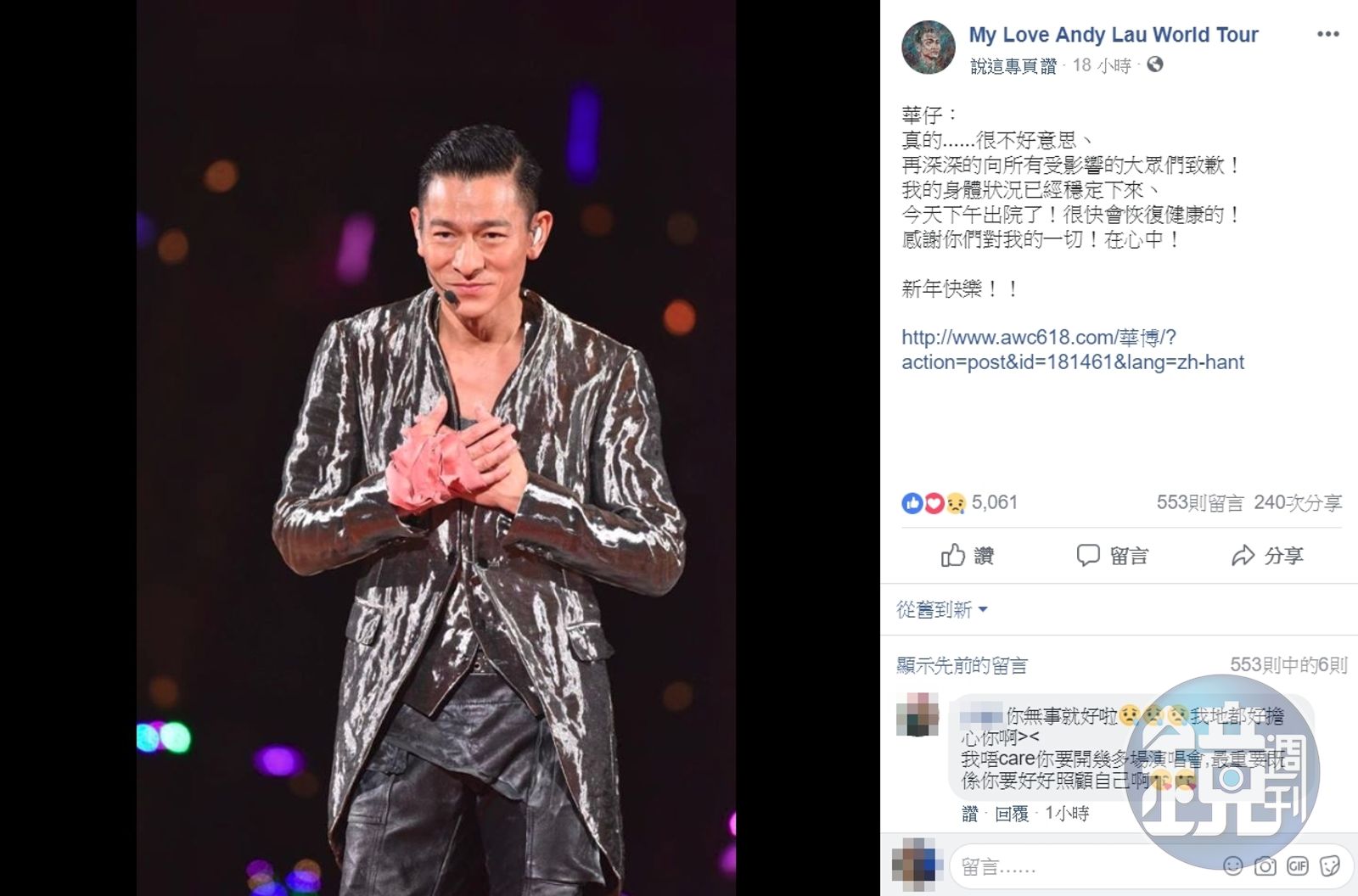 劉德華昨公開表示已經出院回家休養,請大家不要擔心。(翻攝自My Love Andy Lau world Tour臉書)發布時間:2019.01.03 12:39 臺北時間