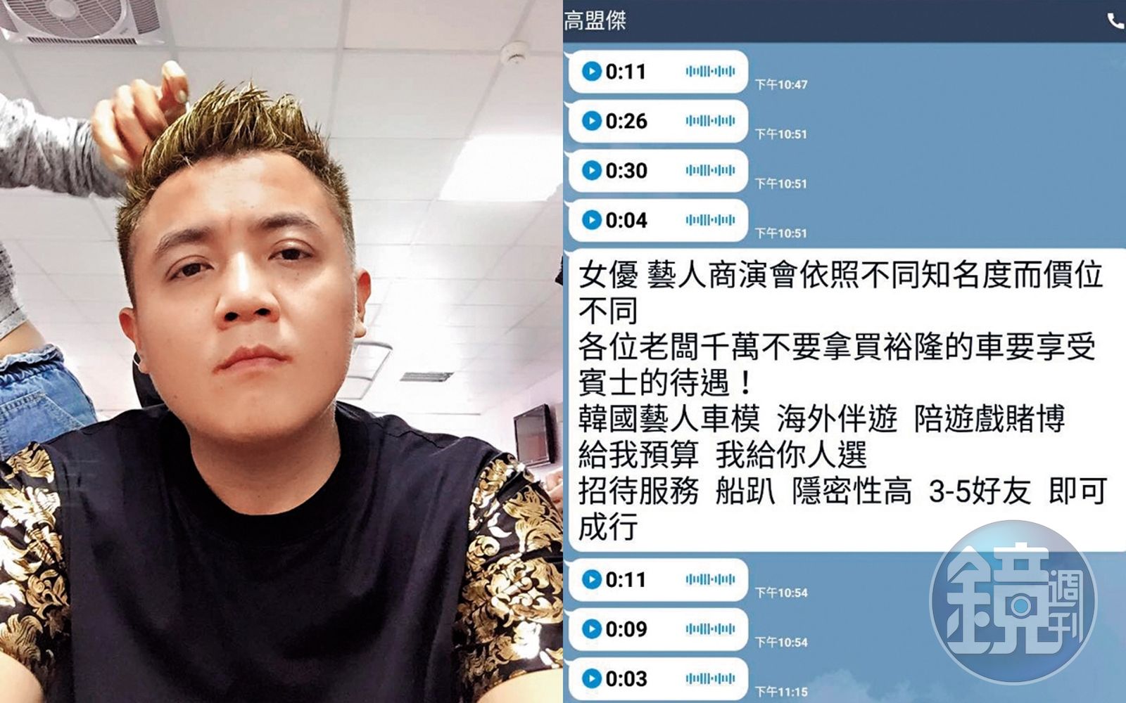 本刊接到來函爆料,裡頭鉅細靡遺指控高盟傑涉嫌三宗罪,包括疑似「媒介賣淫」根據對話的截圖顯示,高盟傑彷彿仲介般,傳了「女優、藝人商演會依照不同知名度而價位不同。各位老闆千萬不要拿買裕隆的車要享受賓士的待遇!韓國藝人車模、海外伴遊、陪遊戲賭博,給我預算,我給你人選。招待服務、船趴、隱密性高,三五好友即可成行」的廣告訊息。