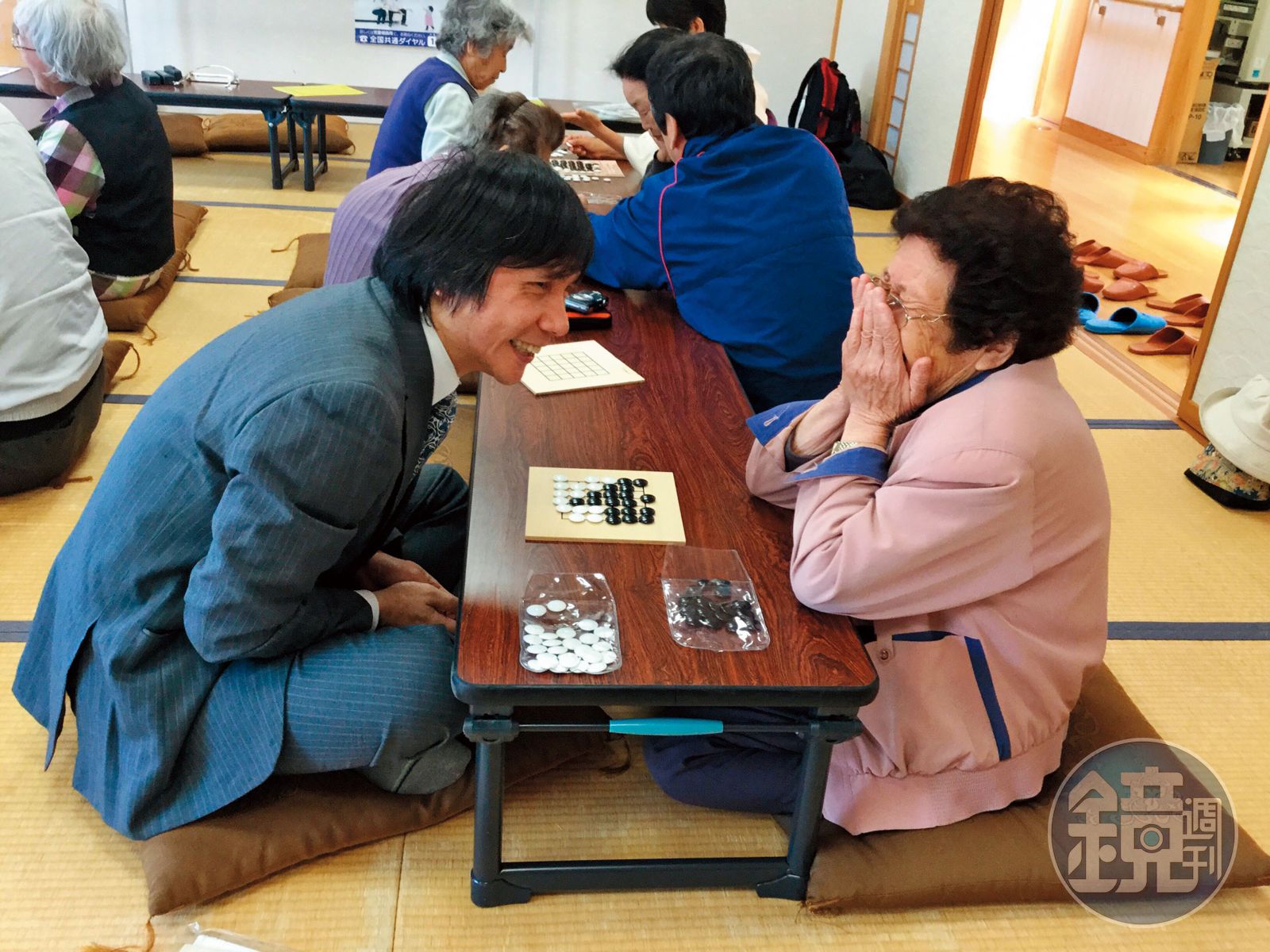 王銘琬眼神緊盯棋坪,頃刻間扳直了背板,手指像蜻蜓,叼起一枚黑棋:「圍棋是比最後誰棋子多,如果代表黑棋,要想辦法包圍白棋,把白棋吃掉。」為了讓人快速理解,他舉例:「就像候選人要發揮影響力,讓更多人投你,除了鐵票,更重要的是中間選民,所以固樁很重要,樁腳一旦被吃,就變成對方地盤。」他說中文帶點日本腔,臉上露出白森森的牙齒,笑得陽光。