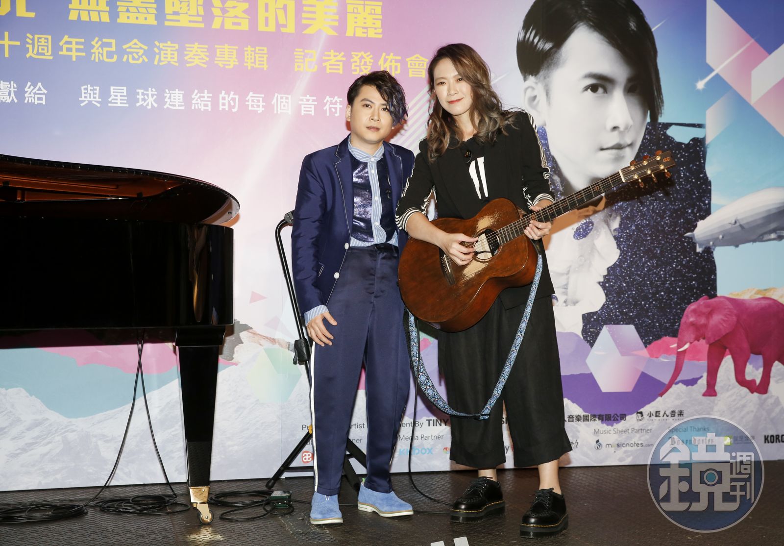 而另一位來站台的張芸京送上地球儀及親手製作的LOGO的棋子,希望V.K克帶著滿滿的經歷走遍全球,2人現場還用吉他、鋼琴合奏名曲〈琴之翼〉,張芸京更特別加碼演唱〈手掌心〉,給足好友面子,V.K克透露初見張芸京時覺得她「仙氣脫俗」,熟識後常出席V.K克演奏會捧場,這次也是一口答應現身記者會站台非常有情有義。