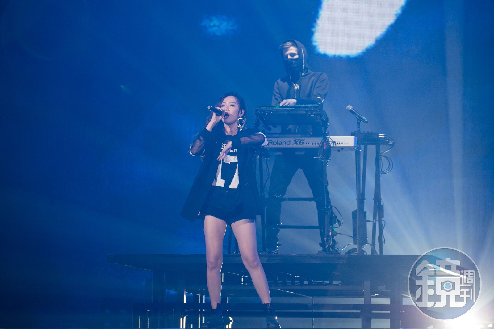 以往有著「外套不穿好、下衣失蹤」的稱號,來嶄露穿搭風格的Julia,這回精心準備兩套風格迥異的戰袍,先以帥氣中性的紅白拼貼工作風背帶褲與熊仔合唱,她笑說:「沒想到吧!這次我居然沒穿外套還穿了長褲!」讓今年在「KKBOX風雲榜」上的吳卓源(Julia)時而小露性感、時而又走酷帥風,驚艷全場粉絲,直呼超有誠意。