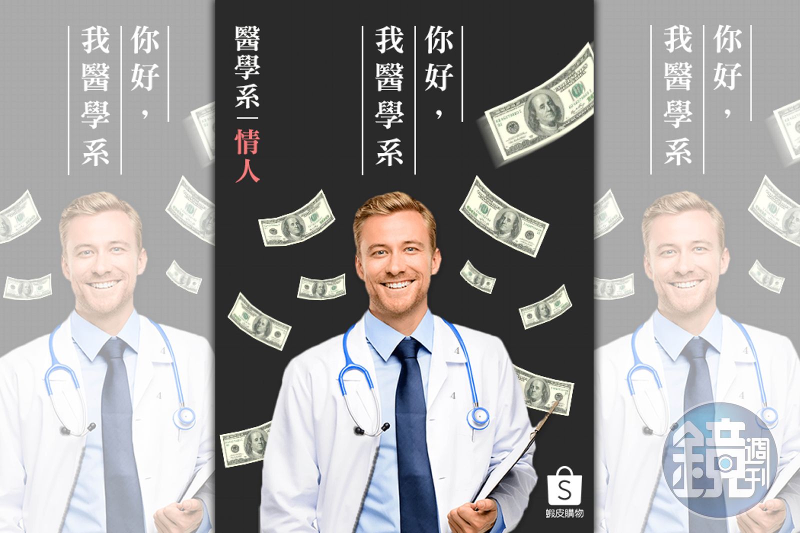 情人節化學系告白情話。(翻攝自蝦皮購物臉書)舞蹈系翻玩偶像劇《紫禁之巔》的哏,最後一張是醫學系「你好,我醫學系」照片為帥氣穿著白袍男性,後面灑滿美金鈔票。讓網友笑翻,直說「這系列這張最好笑」「直接打趴一堆科系了」「完全不用想點子撩妹 ,直接亮招牌」。
