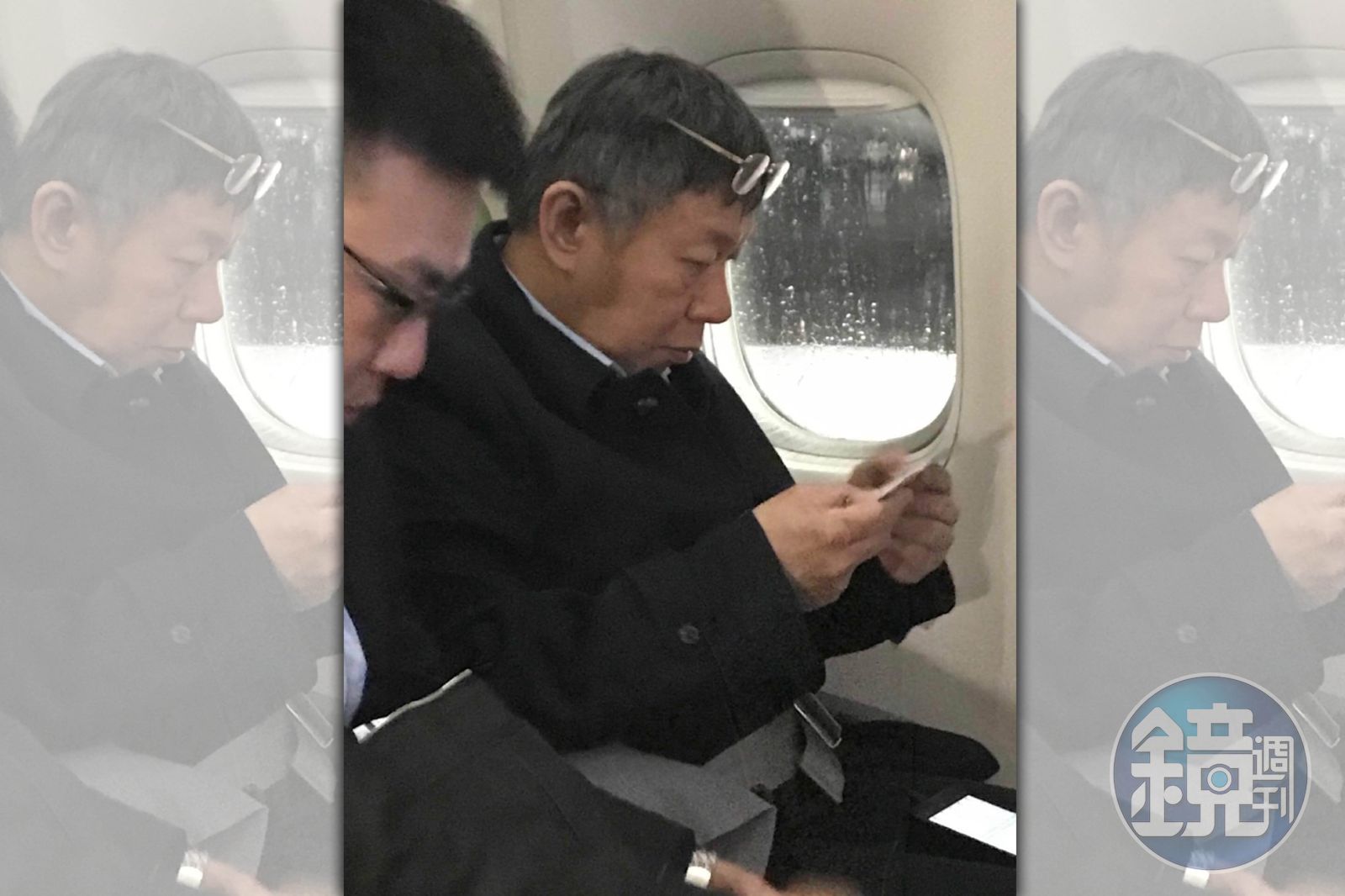 柯文哲昨晚10點多啟程飛往以色列,本刊取得讀者野生捕捉在機上的柯文哲,未搭商務艙,而是坐在經濟艙的座位上看資料。事實上,柯從選前到擔任市長後,出訪都搭經濟艙,未曾搭過商務艙,只有一次出訪荷蘭因機票超賣,才被升等「豪華經濟艙」。柯受訪曾說,坐經濟艙是交通費,出公家的錢,可是要坐商務艙、頭等艙是你個人的需要,不是公家必須要幫你負擔的,「要升級是你家的事,你自己處理就好了。」