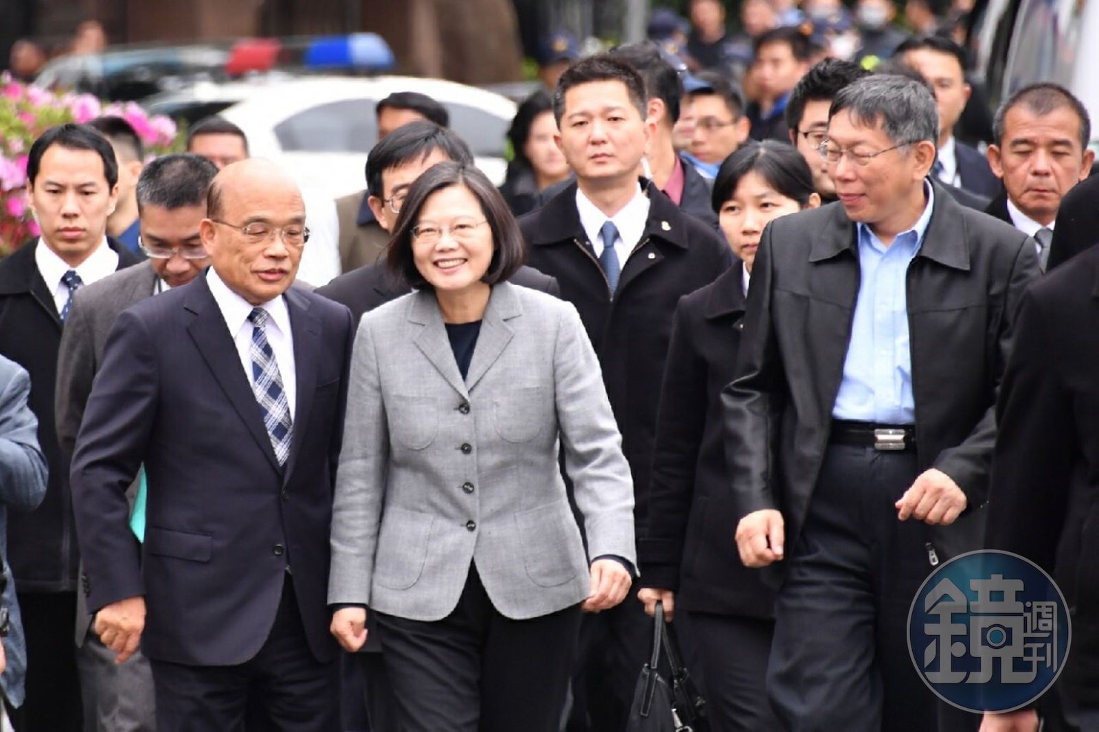 蔡英文及蘇貞昌在柯文哲陪伴下,下午併肩步入228紀念活動會場,3人臉上都帶著笑意,當遇到媒體堵訪時,主辦單位在座位安排上,蔡英文與蘇貞昌相鄰而坐,柯文哲則與蘇貞昌中間隔著228基金會董事長薛化元。