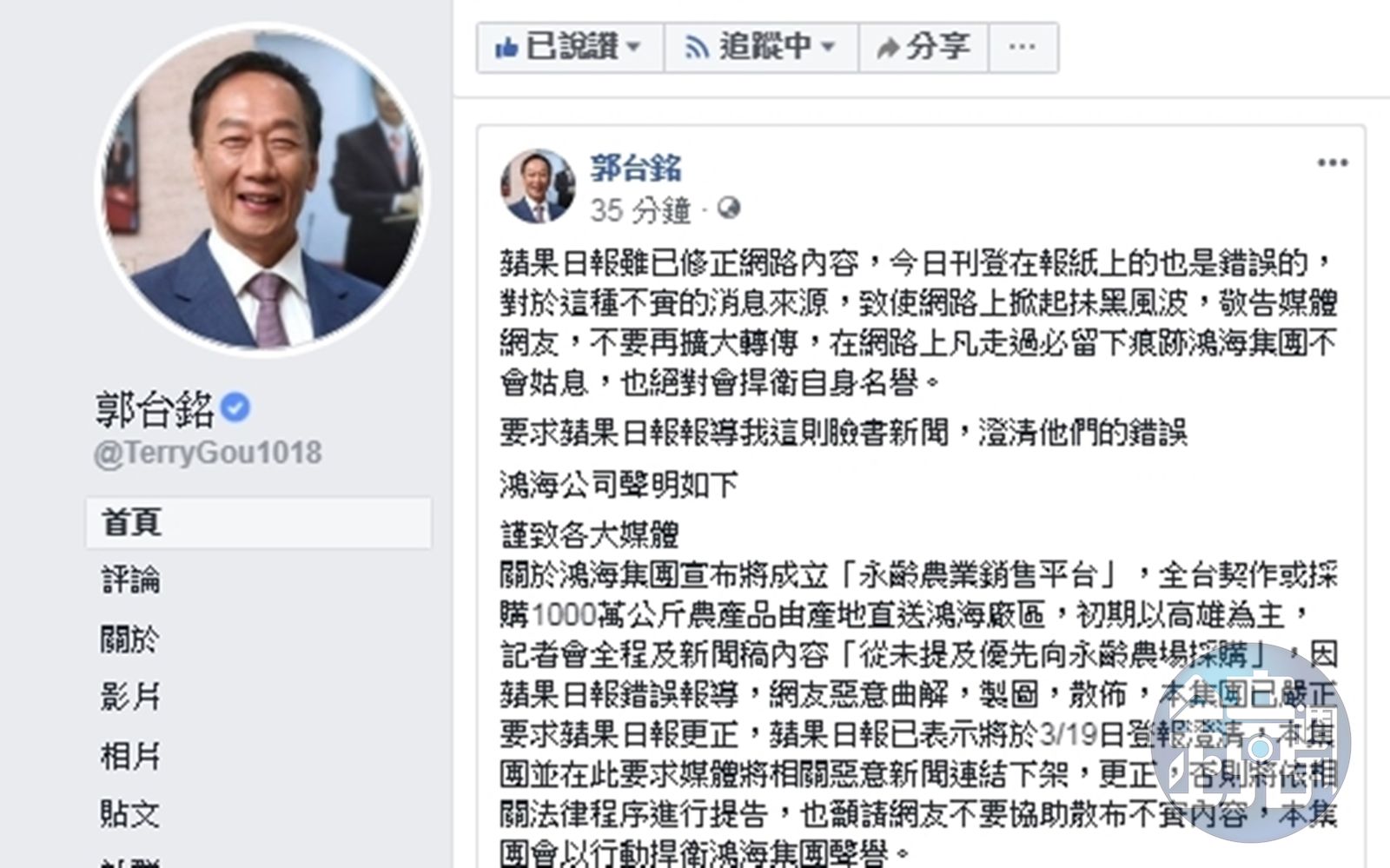 原本係為投資高雄的美意,卻遭部分媒體誤解,讓郭董好生氣,鴻海表示,關於鴻海集團宣布將成立永齡農業銷售平台,全台契作或採購1,000萬公斤農產品由產地直送鴻海廠區,初期以高雄為主,記者會全程及新聞稿內容「從未提及優先向永齡農場採購」,因蘋果日報錯誤報導,網友惡意曲解,製圖,散佈,鴻海已嚴正要求蘋果日報更正,蘋果日報已表示將於3/19日登報澄清,並要求媒體將相關惡意新聞連結下架,更正,否則將依相關法律程序進行提告,鴻海也籲請網友不要協助散布不實內容,集團將會以行動捍衛聲譽。