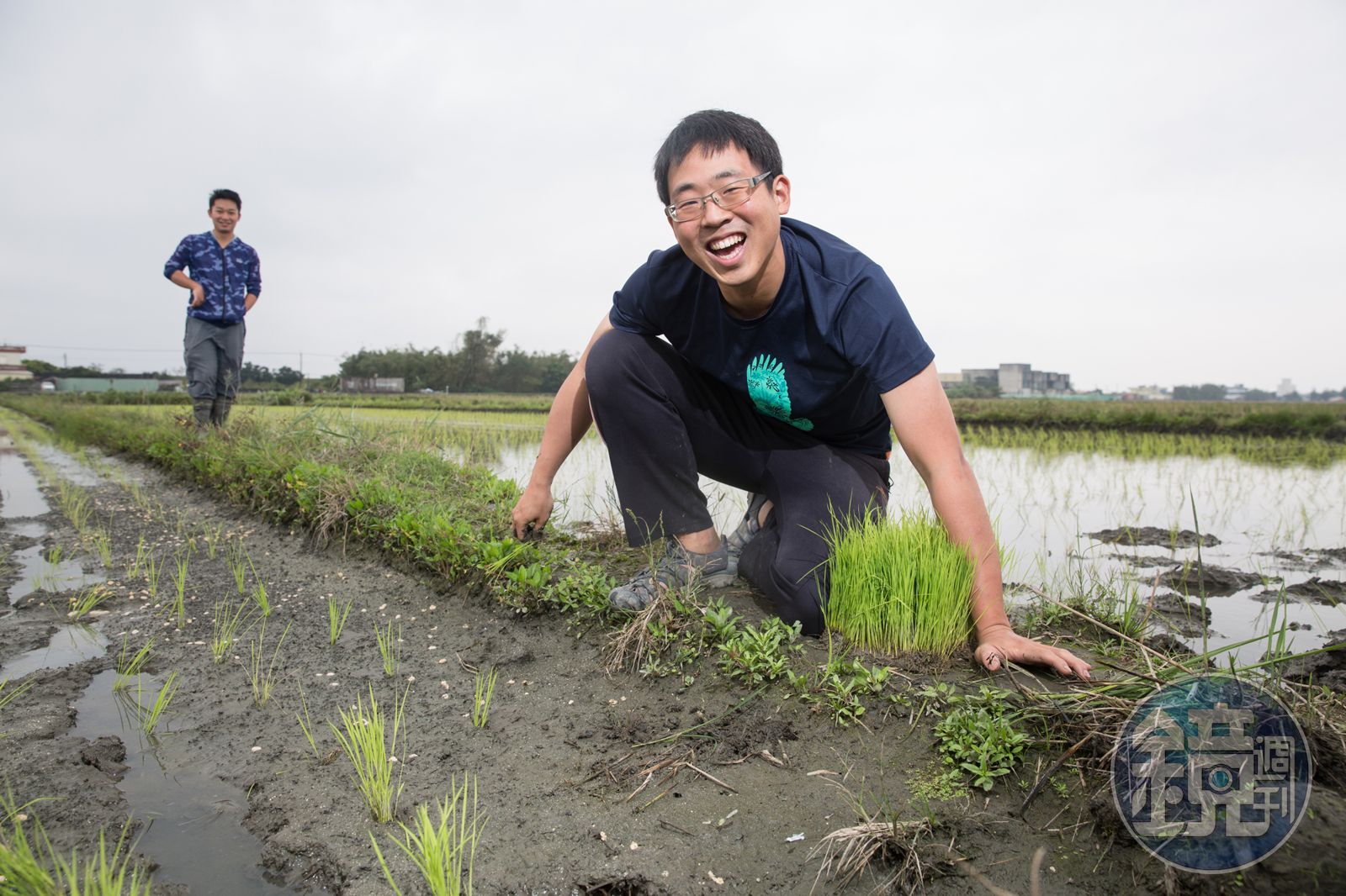 穿著台大自然保育社服,戴著眼鏡的臉還有些圓潤,1990年出生的林哲安,看起來就像個大學生。蹲在田埂邊,前方一小塊區域缺了幾株秧苗,他指著錯雜的小腳印說:「這些是被紅冠水雞吃掉的。」臉上不見懊惱,倒有幾分愉悅,「吃就讓牠們吃啊。」愛鳥的他巴不得自己的田成為鳥類樂園。