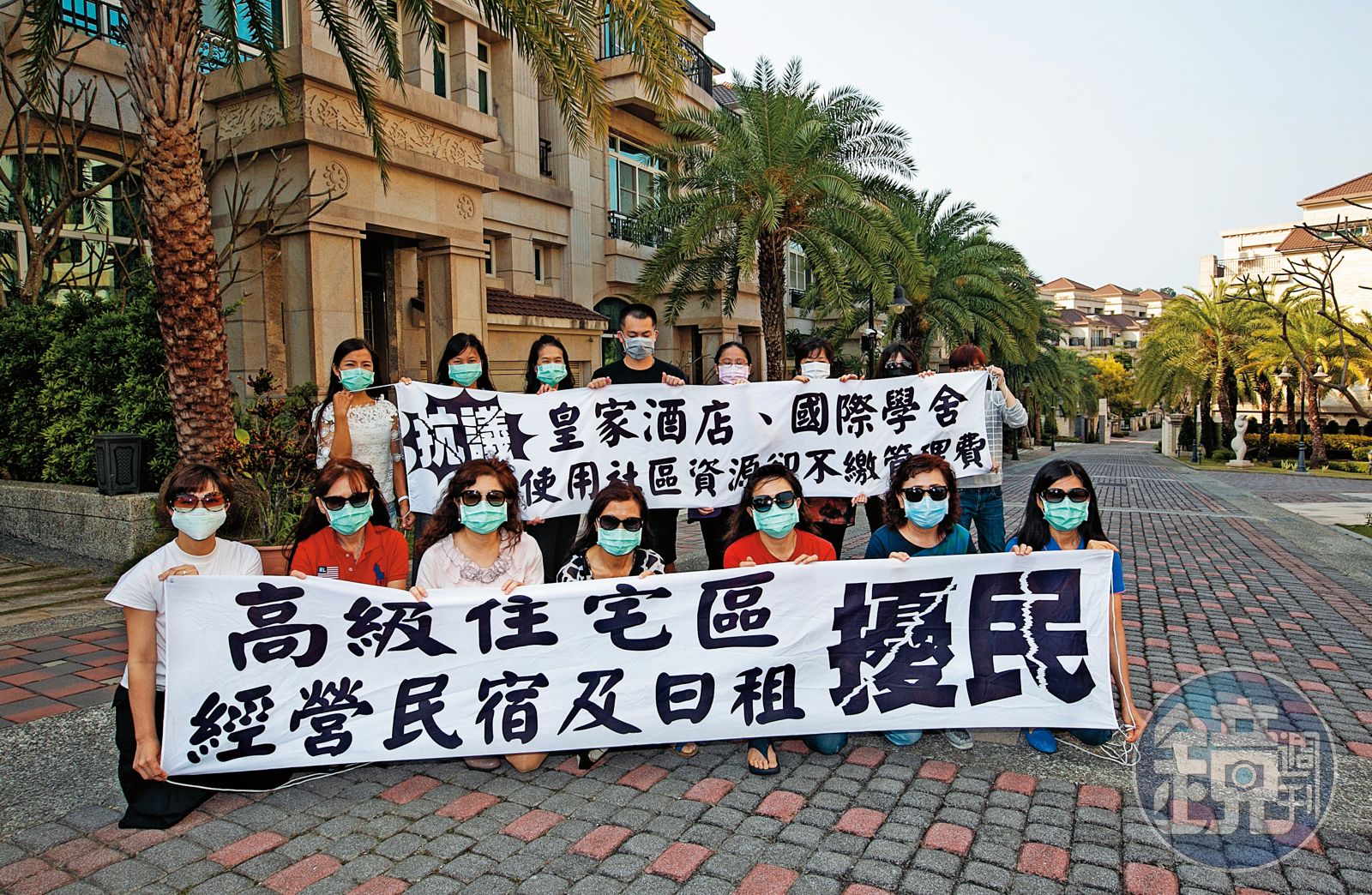 多名住戶集結抗議義大別墅建商與回租戶經營民宿擾民,更涉嫌不當使用社區資源。發布時間:2019.04.03 05:58 臺北時間